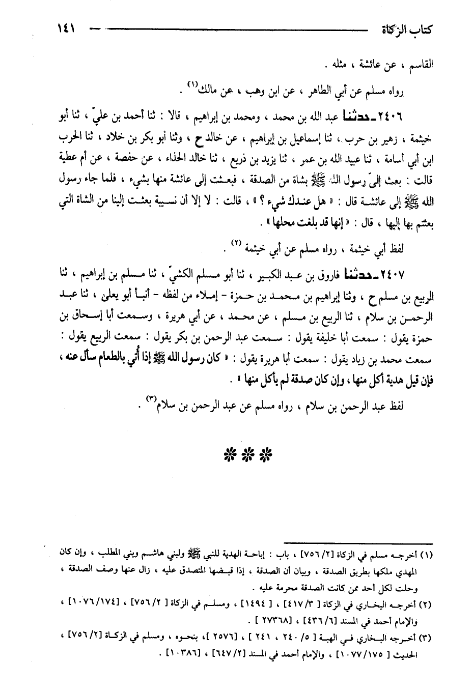 2407 - حَدَّثَنَا فَارُوقُ بْنُ عَبْدِ الْكَبِيرِ ثَنَا أَبُو مُسْلِمٍ الْكَشِّيُّ ثَنَا مُسْلِمُ بْنُ إِبْرَاهِيمَ ثَنَا الرَّبِيعُ بْنُ مُسْلِمٍ ح وَثنا إِبْرَاهِيمَ بْنَ مُحَمَّدِ بْنِ حَمْزَةَ إِمْلاءً مِنْ لَفْظِهِ أَنْبَا أَبُو يَعْلَى ثَنَا عَبْدُ الرَّحْمَنِ بْنُ سَلامٍ ثَنَا الرَّبِيعُ بْنُ مُسْلِمٍ عَنْ مُحَمَّدٍ عَنْ أَبِي هُرَيْرَةَ وَسَمِعْتُ أَبَا إِسْحَاقَ بْنَ حَمْزَةَ يَقُولُ سَمِعْتُ أَبَا خَلِيفَةَ يَقُولُ سَمِعْتُ عَبْدَ الرَّحْمَنِ بْنَ بَكْرِ يَقُولُ سَمِعْتُ الرَّبِيعَ يَقُولُ سَمِعْتُ مُحَمَّدَ بْنَ زِيَادٍ يَقُولُ سَمِعْتُ أَبَا هُرَيْرَةَ يَقُولُ كَانَ رَسُولُ اللَّهِ صَلَّى اللَّهُ عَلَيْهِ وَسَلَّمَ إِذَا أُتِيَ بِالطَّعَامِ سَأَلَ عَنْهُ فَإِنْ قِيلَ هَدِيَّةٌ أَكَلَ مِنْهَا وَإِنْ كَانَ صَدَقَةً لَمْ يَأْكُلْ مِنْهَا