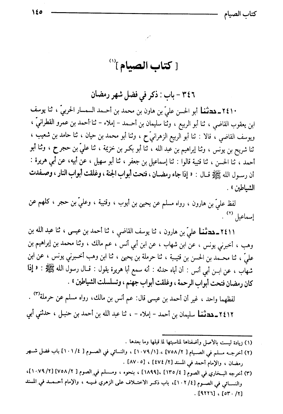 2411 - حَدَّثَنَا عَلِيُّ بْنُ هَارُونَ ثَنَا يُوسُفُ الْقَاضِي ثَنَا أَحْمَدُ بْنُ عِيسَى ثَنَا عَبْدُ اللَّهِ بْنُ وَهْبٍ أَخْبَرَنِي يُونُسُ عَنِ ابْنِ شِهَابٍ عَنِ ابْنِ أَبِي أَنَسٍ عَمِّ مَالِكٍ وَثَنَا مُحَمَّدُ بْنُ إِبْرَاهِيمَ بْنِ عَلِيٍّ ثَنَا مُحَمَّدُ بْنُ الْحَسَنِ بْنِ قُتَيْبَةَ ثَنَا حَرْمَلَةُ بْنُ يَحْيَى ثَنَا ابْنُ وَهْبٍ أَخْبَرَنِي يُونُسُ عَنِ ابْنِ شِهَابٍ عَنِ ابْنِ أَبِي أَنَسٍ أَنَّ أَبَاهُ حَدَّثَهُ أَنَّهُ سَمِعَ أَبَا هُرَيْرَةَ يَقُولُ قَالَ رَسُولُ اللَّهِ صَلَّى اللَّهُ عَلَيْهِ وَسَلَّمَ إِذَا كَانَ رَمَضَانُ فُتِّحَتْ أَبْوَابُ الرَّحْمَةِ وَغُلِّقَتْ أَبْوَابُ جَهَنَّم وتسلسلت الشَّيَاطِين