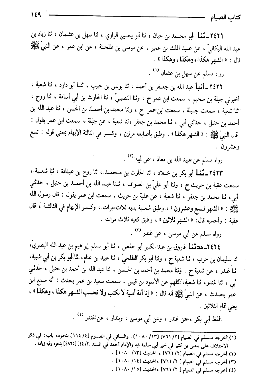 2424 - حَدَّثَنَا فَارُوقُ بْنُ عَبْدِ الْكَبِيرِ أَبُو حَفْصٍ ثَنَا أَبُو مُسْلِمٍ إِبْرَاهِيمُ بْنُ عَبْدِ اللَّهِ الْبَصْرِيُّ ثَنَا سُلَيْمَانُ بْنُ حَرْبٍ ثَنَا شُعْبَةُ ح وَثنا أَبُو بَكْرٍ الطَّلْحِيُّ ثَنَا عُبَيْدُ بْنُ غَنَّامٍ ثَنَا أَبُو بَكْرِ بْنُ أَبِي شَيْبَةَ ثَنَا غُنْدَرٌ عَنْ شُعْبَةُ ح وثنا مُحَمَّدُ بْنُ أَحْمَدَ بْنِ الْحَسَنِ ثَنَا عَبْدُ اللَّهِ بْنُ أَحْمَدَ بْنِ حَنْبَلٍ حَدَّثَنِي أَبِي ثَنَا غُنْدَرٌ ثَنَا شُعْبَةُ كُلُّهُمْ عَنِ الأَسْوَدِ بْنِ قَيْسٍ سَمِعْتُ سَعِيدَ بْنَ عُمَرَ يُحَدِّثُ أَنَّهُ سَمِعَ ابْنَ عُمَرَ يُحَدِّثُ عَنِ النَّبِيِّ صَلَّى اللَّهُ عَلَيْهِ وَسَلَّمَ أَنَّهُ قَالَ إِنَّا أُمَّيَةَ لَا نَكْتُبُ وَلا نَحْسُبُ الشَّهْرَ هَكَذَا وَهَكَذَا يَعْنِي تَمَامَ الثَّلاثِينَ