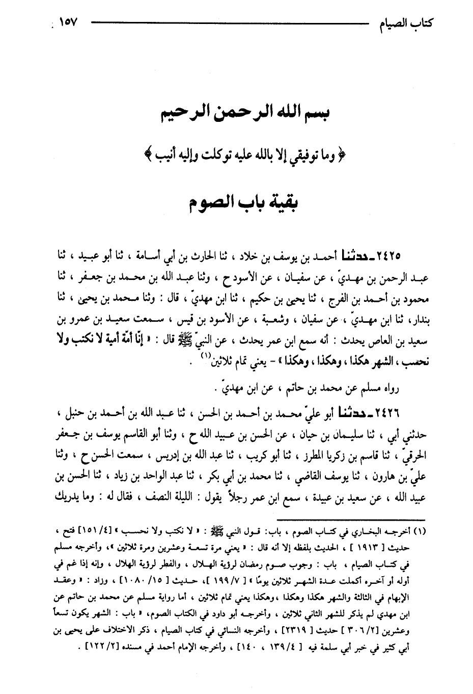 2425 - حَدَّثَنَا أَحْمَدُ بْنُ يُوسُفَ بْنِ خَلادٍ ثَنَا الْحَارِثُ بْنُ أَبِي أُسَامَةَ ثَنَا أَبُو عُبَيْدٍ ثَنَا عَبْدُ الرَّحْمَنِ بْنُ مَهْدِيٍّ عَنْ سُفْيَانَ عَنْ الأَسْوَدِ ح وَثنا عَبْدُ اللَّهِ بْنُ مُحَمَّدِ بْنِ جَعْفَرٍ ثَنَا مَحْمُودُ بْنُ أَحْمَدَ بْنِ الْفَرَجِ ثَنَا يَحْيَى بْنُ حَكِيمٍ ثَنَا ابْنُ مَهْدِيٍّ قَالَ وَثنا مُحَمَّدُ بْنُ يَحْيَى ثَنَا بُنْدَارٌ ثَنَا ابْنُ مَهْدِيٍّ عَنْ سُفْيَانَ وَشُعْبَةَ عَنِ الأَسْوَدِ بْنِ قَيْسٍ سَمِعْتُ سَعِيدِ بْنِ عَمْرِو بْنِ سَعِيدِ بْنِ الْعَاصِ يُحَدِّثُ أَنَّهُ سَمِعَ ابْنَ عُمَرَ يُحَدِّثُ عَنِ النَّبِيِّ صَلَّى اللَّهُ عَلَيْهِ وَسَلَّمَ قَالَ إِنَّا أُمَّةٌ أُمِّيَّةٌ لَا نَكْتُبُ وَلا نَحْسُبُ الشَّهْرَ هَكَذَا وَهَكَذَا وَهَكَذَا يَعْنِي تَمَامَ ثَلاثِينَ