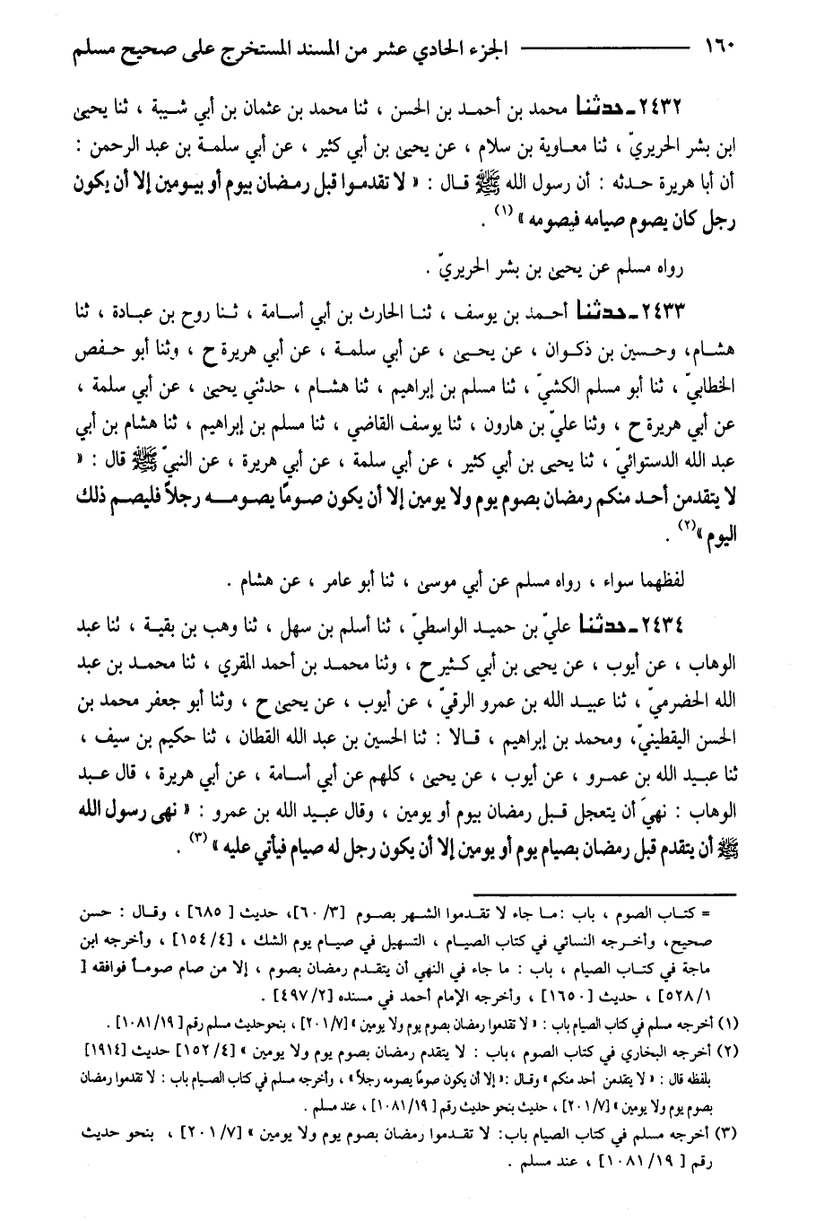 2433 - حَدَّثَنَا أَحْمَدُ بْنُ يُوسُفَ ثَنَا الْحَارِثُ بْنُ أَبِي أُسَامَةَ ثَنَا رَوْحُ بْنُ عُبَادَةَ ثَنَا هِشَامٌ وَحُسَيْنُ بْنُ ذَكْوَانَ عَنْ يَحْيَى عَنْ أَبِي سَلَمَةَ عَنْ أَبِي هُرَيْرَةَ ح وثنا أَبُو حَفْصٍ الْخَطَّابِيُّ ثَنَا أَبُو مُسْلِمٍ الْكَشِّيُّ ثَنَا مُسْلِمُ بْنُ إِبْرَاهِيمَ ثَنَا هِشَامٌ حَدَّثَنِي يَحْيَى عَنْ أَبِي سَلَمَةَ عَنْ أَبِي هُرَيْرَةَ ح وَثنا عَلِيُّ بْنُ هَارُونَ ثَنَا يُوسُفُ الْقَاضِي ثَنَا مُسْلِمُ بْنُ إِبْرَاهِيمَ ثَنَا هِشَامُ بْنُ أَبِي عَبْدِ اللَّهِ الدَّسْتُوَائِيُّ ثَنَا يَحْيَى بْنِ أَبِي كَثِيرٍ عَنْ أَبِي سَلَمَةَ عَنْ أَبِي هُرَيْرَةَ عَنِ النَّبِيِّ صَلَّى اللَّهُ عَلَيْهِ وَسَلَّمَ قَالَ لَا يَتَقَدَّمَنَّ أَحَدٌ مِنْكُمْ رَمَضَانَ بِصَوْمِ يَوْمٍ وَلا يَوْمَيْنِ إِلَّا أَن يكون صوما يَصُومهُ رجلا فَلْيَصُمْ ذَلِكَ الْيَوْمَ