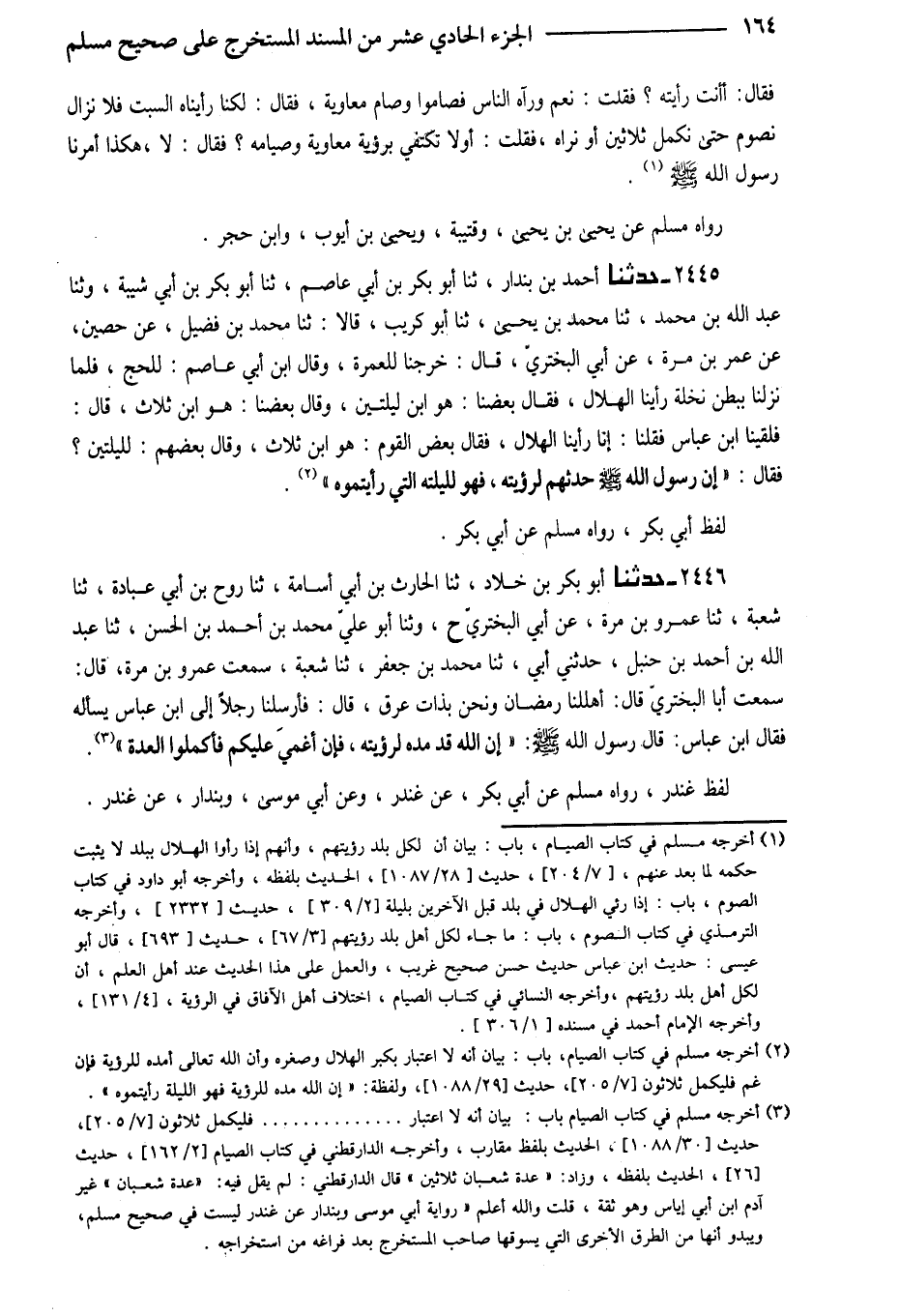 2445 - حَدَّثَنَا أَحْمَدُ بْنُ بُنْدَارٍ ثَنَا أَبُو بَكْرِ بْنُ أَبِي عَاصِمٍ ثَنَا أَبُو بَكْرِ بْنُ أَبِي شَيْبَةَ وَثنا عَبْدُ اللَّهِ بْنُ مُحَمَّدٍ ثَنَا مُحَمَّدُ بْنُ يَحْيَى ثَنَا أَبُو كُرَيْبٍ قَالا ثَنَا مُحَمَّدُ بْنُ فُضَيْلٍ عَنْ حُصَيْنٍ عَنْ عُمَرَ بْنِ مُرَّةَ عَنْ أَبِي الْبَخْتَرِيِّ قَالَ خَرَجْنَا لِلْعُمْرَةِ وَقَالَ ابْنُ أَبِي عَاصِمٍ لِلْحَجِّ فَلَمَّا نَزَلْنَا بِبَطْنِ نَخْلَةَ رَأَيْنَا الْهِلالَ فَقَالَ بَعْضُنَا هُوَ ابْنُ لَيْلَتَيْنِ وَقَالَ بَعْضُنا هُوَ ابْنُ ثَلاثٍ قَالَ فَلَقِينَا ابْنَ عَبَّاسٍ فَقُلْنَا إِنَّا رَأَيْنَا الْهِلالَ فَقَالَ بَعْضُ الْقَوْمِ هُوَ ابْنُ ثَلاثٍ وَقَالَ بَعْضُهُمْ لِلَيْلَتَيْنِ فَقَالَ إِنَّ رَسُولُ اللَّهِ صَلَّى اللَّهُ عَلَيْهِ وَسَلَّمَ حَدَّثَهُمْ لِرُؤْيَتِهِ فَهُوَ لِلَيْلَتِهِ الَّتِي رَأَيْتُمُوهُ