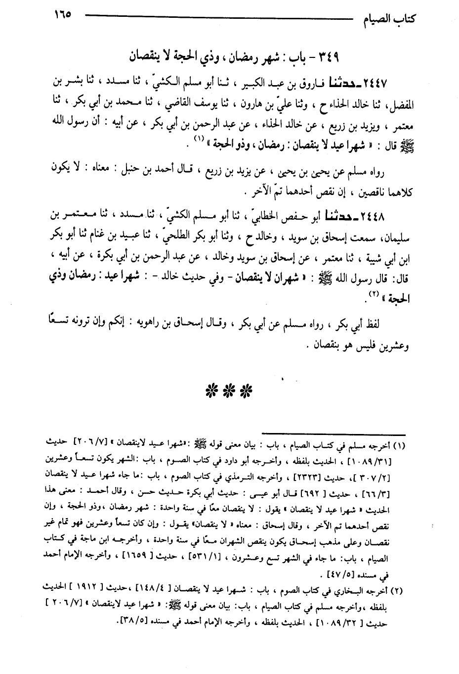 رَوَاهُ مُسْلِمٌ عَنْ يَحْيَى بْنِ يَحْيَى عَنْ يَزِيدِ بْنِ زُرَيْعٍ قَالَ أَحْمَدُ بْنُ حَنْبَلٍ مَعْنَاهُ لَا يَكُونُ كِلاهُمَا نَاقِصَيْنِ إِنْ نَقَصَ أَحَدُهُمَا تَمَّ الْآخَرُ