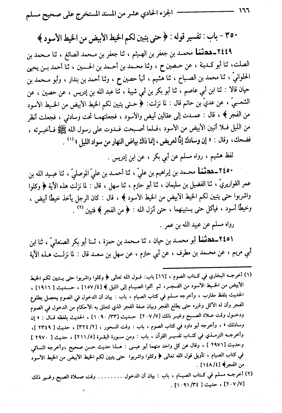 2449 - حَدَّثَنَا مُحَمَّدُ بْنُ جَعْفَرِ بْنِ الْهَيْثَم ثَنَا جَعْفَر بن مُحَمَّد الصَّائِغُ ثَنَا مُحَمَّدُ بْنُ الصَّلْتِ ثَنَا أَبُو كُدَيْنَةَ عَنْ حُصَيْنٍ ح وثنا مُحَمَّدُ بْنُ أَحْمَدَ بْنُ الْحُسَيْنِ ثَنَا أَحْمَدُ بْنُ يَحْيَى الْحُلْوَانِيُّ ثَنَا مُحَمَّدُ بْنُ الصَّبَّاحِ ثَنَا هُشَيْمٌ أَنْبَا حُصَيْنٌ ح وَثَنَا أحَمْدُ بْنُ بُنْدَارٍ وَأَبُو مُحَمَّد بن جيان قَالا ثَنَا ابْنُ أَبِي عَاصِمٍ ثَنَا أَبُو بَكْرِ بْنُ أَبِي شَيْبَةَ ثَنَا عَبْدُ اللَّهِ بْنُ إِدْرِيسَ عَنْ حُصَيْنٍ عَنِ الشَّعْبِيِّ عَنْ عَدِيِّ بْنِ حَاتِمٍ قَالَ لَمَّا نَزَلَتْ {حَتَّى يَتَبَيَّنَ لَكُمُ الْخَيْطُ الأَبْيَضُ مِنَ الْخَيْطِ الأَسْوَدِ من الْفجْر} قَالَ عَمَدْتُ إِلَى عِقَالَيْنِ أَبْيَضَ وَالأَسْوَدِ فَجَعَلْتُهُمَا تَحْتَ وِسَادَتِي فَجَعَلْتُ أَنْظُرُ مِنَ اللَّيْلِ فَلا أَتَبَيَّنُ الأَبْيَضَ مِنَ الأَسْوَدِ فَلَمَّا أَصْبَحْتُ غَدَوْتُ عَلَى رَسُولِ اللَّهِ صَلَّى اللَّهُ عَلَيْهِ وَسَلَّمَ فَأَخْبَرْتُهُ فَضَحِكَ وَقَالَ إِنَّ وِسَادَكَ إِذًا لَعَرِيضٌ إِنَّمَا ذَاكَ بَيَاضُ النَّهَارِ مِنْ سَوَادِ اللَّيْلِ