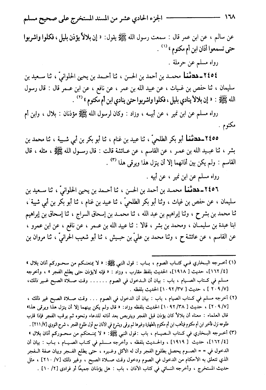 2454 - حَدَّثَنَا مُحَمَّدُ بْنُ أَحْمَدَ بْنِ الْحَسَنُ ثَنَا أَحْمَدُ بْنُ يَحْيَى الْحُلْوَانِيُّ ثَنَا سَعِيدُ بْنُ سُلَيْمَانَ ثَنَا حَفْصُ بْنُ غِيَاثٍ عَنْ عُبَيْدُ اللَّهِ بْنُ عُمَرَ عَنْ نَافِعٍ عَنِ ابْنِ عُمَرَ قَالَ قَالَ رَسُولُ اللَّهِ صَلَّى اللَّهُ عَلَيْهِ وَسَلَّمَ إِنَّ بِلالًا يُنَادِي بِلَيْلٍ فَكُلُوا وَاشْرَبُوا حَتَّى يُنَادِيَ ابْنِ أُمِّ مَكْتُومٍ