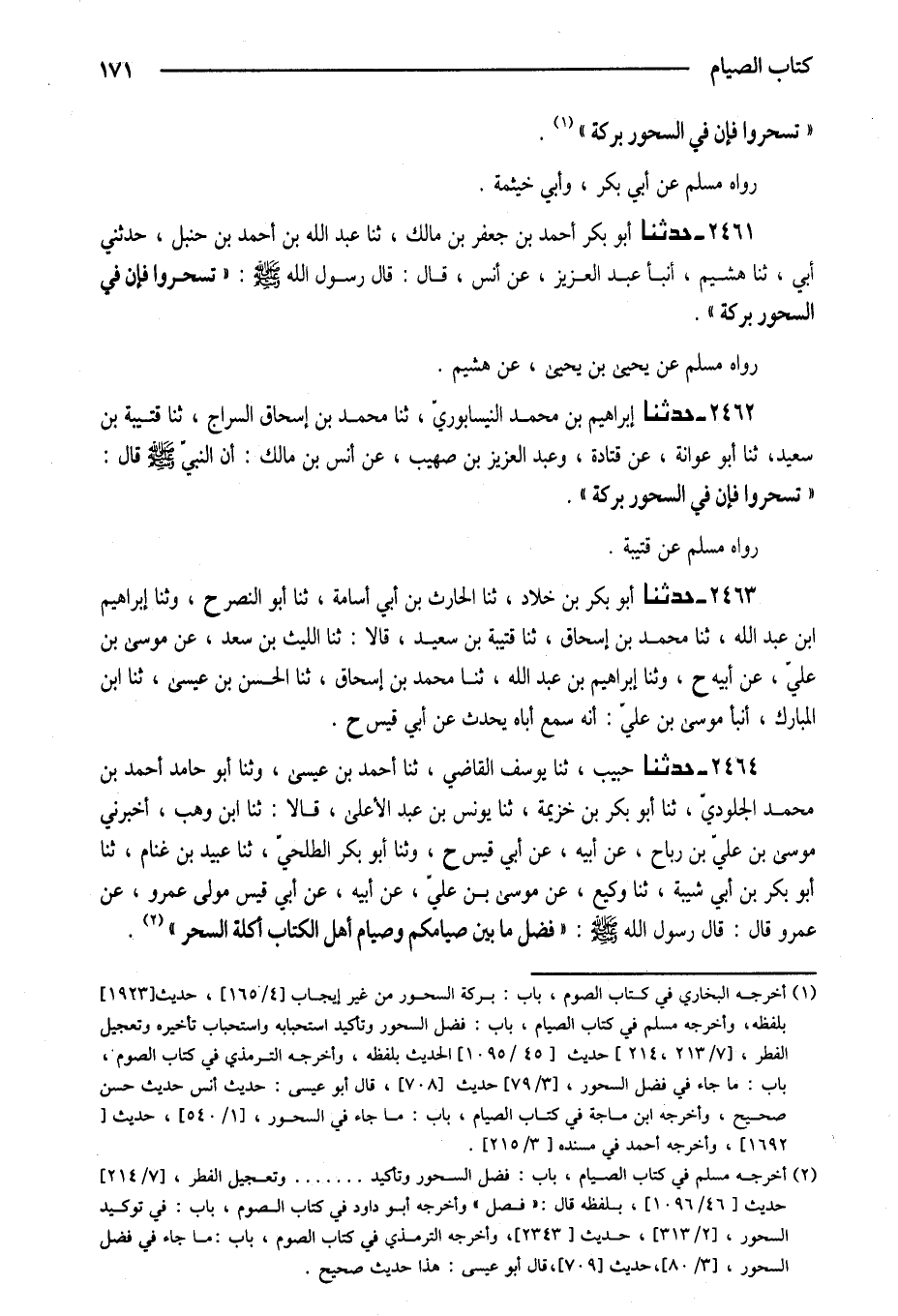 2462 - حَدَّثَنَا إِبْرَاهِيمُ بْنُ مُحَمَّدٍ النَّيْسَابُورِيُّ ثَنَا مُحَمَّدُ بْنُ إِسْحَاقَ السَّرَّاجُ ثَنَا قُتَيْبَةُ بْنُ سَعِيدٍ ثَنَا أَبُو عَوَانَةَ عَنْ قَتَادَةَ وَعَبْدِ الْعَزِيزِ بْنِ صُهَيْبٍ عَنْ أَنَسِ بْنِ مَالِكٍ أَنَّ النَّبِيِّ صَلَّى اللَّهُ عَلَيْهِ وَسَلَّمَ قَالَ تَسَحَّرُوا فَإِنَّ فِي السَّحُورِ بَرَكَةً