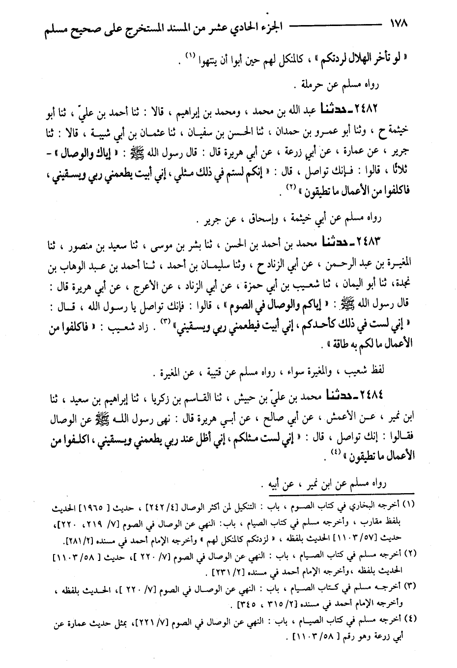 2482 - حَدَّثَنَا عَبْدُ اللَّهِ بْنُ مُحَمَّدِ وَمُحَمَّدُ بْنُ إِبْرَاهِيمَ قَالا ثَنَا أَحْمَدُ بْنُ عَلِيٍّ ثَنَا أَبُو خَيْثَمَةَ ح وَثنا أَبُو عَمْرِو بْنُ حَمْدَانَ ثَنَا الْحَسَنُ بْنُ سُفْيَانَ ثَنَا عُثْمَانُ بْنُ أَبِي شَيْبَةَ قَالا ثَنَا جَرِيرٌ عَنْ عُمَارَةَ عَنْ أَبِي زُرْعَةَ عَنْ أَبِي هُرَيْرَةَ قَالَ قَالَ رَسُولُ اللَّهِ صَلَّى اللَّهُ عَلَيْهِ وَسَلَّمَ إياك وَالْوِصَالَ ثَلاثًا قَالُوا فَإِنَّكَ تُوَاصِلُ قَالَ إِنَّكُمْ لَسْتُمْ فِي ذَلِكَ مِثْلِي إِنِّي أَبِيتُ يُطْعِمُنِي رَبِّي وَيَسْقِينِي فَاكْلَفُوا مِنَ الأَعْمَالِ مَا تُطِيقُونَ