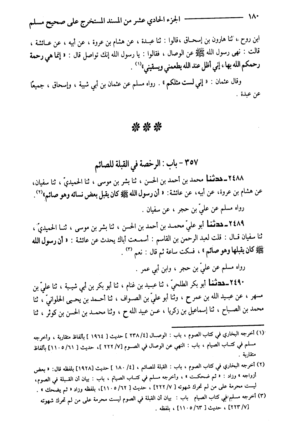 - 32488 حَدَّثَنَا مُحَمَّدُ بْنُ أَحْمَدَ بْنِ الْحَسَنِ ثَنَا بِشْرُ بْنُ مُوسَى ثَنَا الْحُمَيْدِيُّ ثَنَا سُفْيَانُ عَنْ هِشَامِ بْنِ عُرْوَةَ عَنْ أَبِيهِ عَنْ عَائِشَةَ أَنَّ رَسُولَ اللَّهِ صَلَّى اللَّهُ عَلَيْهِ وَسَلَّمَ كَانَ يُقَبِّلُ بَعْضَ نِسَائِهِ وَهُوَ صَائِمٌ