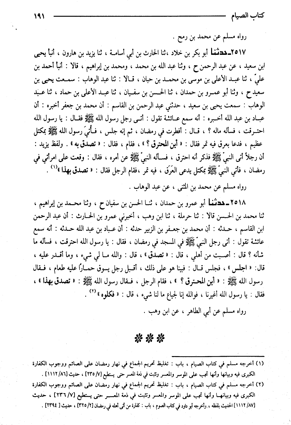 2518 - حَدَّثَنَا أَبُو عَمْرِو بْنُ حَمْدَانَ ثَنَا الْحَسَنُ بْنُ سُفْيَانَ ح وَثَنَا مُحَمَّدُ بْنُ إِبْرَاهِيمَ ثَنَا مُحَمَّدُ بْنُ الْحَسَنِ قَالا ثَنَا حَرْمَلَةُ ثَنَا ابْنُ وَهْبٍ أَخْبَرَنِي عَمْرُو بْنُ الْحَارِثِ أَنَّ عَبْدَ الرَّحْمَنِ ابْن الْقَاسِمِ حَدَّثَهُ أَنَّ مُحَمَّدَ بْنَ جَعْفَرِ بْنِ الزُّبَيْرِ حَدَّثَهُ أَنَّ عَبَّادَ بْنَ عَبْدِ اللَّهِ حَدَّثَهُ أَنَّهُ سَمِعَ عَائِشَةَ تَقُولُ أَتَى رَجُلٌ النَّبِيَّ صَلَّى اللَّهُ عَلَيْهِ وَسَلَّمَ فِي الْمَسْجِدِ فِي رَمَضَانَ فَقَالَ يَا رَسُولَ اللَّهِ احْتَرَقْتُ فَسَأَلَهُ مَا شَأْنُهُ قَالَ أَصَبْتُ مِنْ أَهْلِي قَالَ تَصَدَّقْ قَالَ وَاللَّهِ مَا لِي شَيْءٌ وَمَا أَقْدِرُ عَلَيْهِ قَالَ اجْلِسْ فَجَلَسَ قَالَ فَبَيْنَا هُوَ عَلَى ذَلِكَ أَقْبَلَ رَجُلٌ يَسُوقُ حِمَارًا عَلَيْهِ طَعَامٌ فَقَالَ رَسُولُ اللَّهِ صَلَّى اللَّهُ عَلَيْهِ وَسَلَّمَ أَيْنَ الْمُحْتَرِقُ فَقَامَ الرَّجُلُ فَقَالَ رَسُولُ اللَّهِ صَلَّى اللَّهُ عَلَيْهِ وَسَلَّمَ تَصَدَّقْ بِهَذَا فَقَالَ يَا رَسُولَ اللَّهِ أَغَيْرَنَا فَوَاللَّهِ إِنَّا لَجِيَاعٌ مَا لَنَا شَيْءٌ قَالَ فَكُلُوهُ