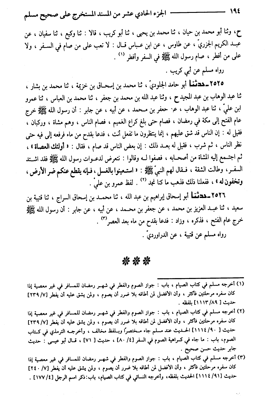 2525 - حَدَّثَنَا أَبُو حَامِدٍ الْجُلُودِيُّ ثَنَا مُحَمَّدُ بْنُ إِسْحَاقَ بْنِ خُزَيْمَةَ ثَنَا مُحَمَّدُ بْنُ بَشَّارٍ ثَنَا عَبْدُ الْوَهَّابِ بْنُ عَبْدِ الْمَجِيدِ ح وَثَنَا عَبْدُ اللَّهِ بْنُ مُحَمَّدِ بْنِ جَعْفَرٍ ثَنَا مُحَمَّدُ بْنُ الْعَبَّاس ثَنَا عَمْرو ابْن عَلِيٍّ ثَنَا عَبْدُ الْوَهَّابِ عَنْ جَعْفَرِ بْنِ مُحَمَّدٍ عَنْ أَبِيهِ عَنْ جَابِرٍ أَنَّ رَسُولَ اللَّهِ صَلَّى اللَّهُ عَلَيْهِ وَسَلَّمَ خَرَجَ عَامَ الْفَتْحِ إِلَى مَكَّةَ فِي رَمَضَانَ فَصَامَ حَتَّى بَلَغَ كُرَاعَ الْغَمِيمِ فَصَامَ النَّاسُ وَهُمْ مُشَاةٌ وَرُكْبَانٌ فَقِيلَ لَهُ إِنَّ النَّاسَ قَدْ شَقَّ عَلَيْهِمْ إِنَّمَا يَنْتَظِرُونَ مَا تَفْعَلُ أَنْتَ فَدَعَا بِقَدَحٍ مِنْ مَاءٍ فَرَفَعَهُ إِلَى فِيهِ حَتَّى نَظَرَ النَّاسُ ثُمَّ شَرِبَ فَقِيلَ لَهُ بَعْدَ ذَلِكَ إِنَّ بَعْضَ النَّاسِ قَدْ صَامَ فَقَالَ أُولَئِكَ الْعُصَاةُ ثُمَّ اجْتَمَعَ إِلَيْهِ الْمُشَاةُ مِنْ أَصْحَابِهِ فَصُفُّوا لَهُ وَقَالُوا نَتَعَرَّضُ لِدَعَوَاتِ رَسُولِ اللَّهِ صَلَّى اللَّهُ عَلَيْهِ وَسَلَّمَ فَقَدْ اشْتَدَّ السَّفَرُ وَطَالَتِ الشُّقَّةُ فَقَالَ لَهُمُ النَّبِيُّ صَلَّى اللَّهُ عَلَيْهِ وَسَلَّمَ اسْتَعِينُوا بِالْغُسْلِ فَإِنَّهُ يَقْطَعُ عَنْكُمْ ضُرَّ الأَرْضِ وَتَخَفَّوْنَ لَهُ فَفَعَلْنَا ذَلِكَ فَذَهَبَ مَا كُنَّا نَجِدُ