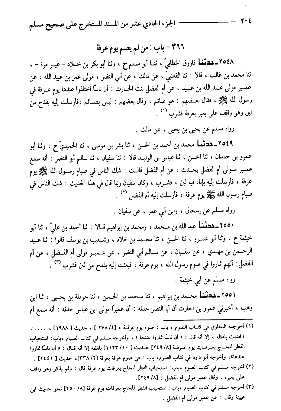 2550 - حَدَّثَنَا عبد اللَّهِ بْنُ مُحَمَّدٍ وَمُحَمَّدُ بْنُ إِبْرَاهِيمَ قَالا ثَنَا أَحْمَدُ بْنُ عَلِيٍّ ثَنَا أَبُو خَيْثَمَةَ ح وَثنا أَبُو عَمْرٍو ثَنَا الْحَسَنُ ثَنَا مُحَمَّدُ بْنُ خَلادٍ وَشُعَيْبُ بْنُ يُوسُفَ قَالُوا ثَنَا عَبْدُ الرَّحْمَنِ بْنُ مَهْدِيٍّ عَنْ سُفْيَانَ عَنْ سَالِمٍ أَبِي النَّضْرِ عَنْ عُمَيْرٍ مَوْلَى أُمِّ الْفَضْلِ عَنْ أُمِّ الْفَضْلِ أَنَّهُمْ تَمَارَوْا فِي صَوْمِ رَسُولِ اللَّهِ صَلَّى اللَّهُ عَلَيْهِ وَسَلَّمَ يَوْمَ عَرَفَةَ فَبَعَثَتْ إِلَيْهِ بِقَدَحٍ مِنْ لَبَنٍ فَشَرِبَ