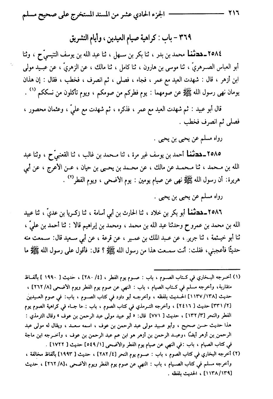 2584 - حَدَّثَنَا مُحَمَّدُ بْنُ بَدْرٍ ثَنَا بَكْرُ بْنُ سَهْلٍ ثَنَا عَبْدُ اللَّهِ بْنُ يُوسُفَ التِّنِّيسِيُّ ح وثنا أَبُو الْعَبَّاس الصرهري ثَنَا مُوسَى بْنُ هَارُونَ ثَنَا كَامِلٌ ثَنَا مَالِكٌ عَنِ الزُّهْرِيِّ عَن عُبَيْدٍ مَوْلَى ابْنِ أَزْهَرَ قَالَ شَهِدْتُ الْعِيدَ مَعَ عُمَرَ فَجَاءَ فَصَلَّى ثُمَّ انْصَرَفَ فَخَطَبَ فَقَالَ إِنَّ هَذَانِ يَوْمَانِ نَهَى رَسُولُ اللَّهِ صَلَّى اللَّهُ عَلَيْهِ وَسَلَّمَ عَنْ صَوْمِهِمَا يَوْمُ فِطْرِكُمْ مِنْ صَوْمِكُمْ وَيَوْمُ تَأْكُلُونَ مِنْ نُسُكِكُمْ
