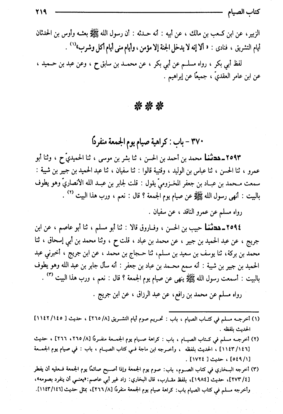 2593 - حَدَّثَنَا مُحَمَّدُ بْنُ أَحْمَدَ بْنِ الْحَسَنِ ثَنَا بِشْرُ بْنُ مُوسَى ثَنَا الْحُمَيْدِيُّ ح وَثنا أَبُو عَمْرٍو ثَنَا الْحَسَنُ ثَنَا عَبَّاسُ بْنُ الْوَلِيدِ وَقُتَيْبَةُ قَالُوا ثَنَا سُفْيَانُ ثَنَا عَبْدُ الْحَمِيدِ بْنُ جُبَيْرِ بْنِ شَيْبَةَ سَمِعْتُ مُحَمَّدَ بْنَ عَبَّادِ بْنِ جَعْفَرٍ الْمَخْزُومِيَّ يَقُولُ قُلْتُ لِجَابِرِ بْنِ عَبْدِ اللَّهِ الأَنْصَارِيِّ وَهُوَ يَطُوفُ بِالْبَيْتِ أَنَهَى رَسُولُ اللَّهِ صَلَّى اللَّهُ عَلَيْهِ وَسَلَّمَ عَنْ صِيَامِ يَوْمِ الْجُمُعَةِ قَالَ نَعَمْ وَرَبِّ هَذَا الْبَيْتِ
