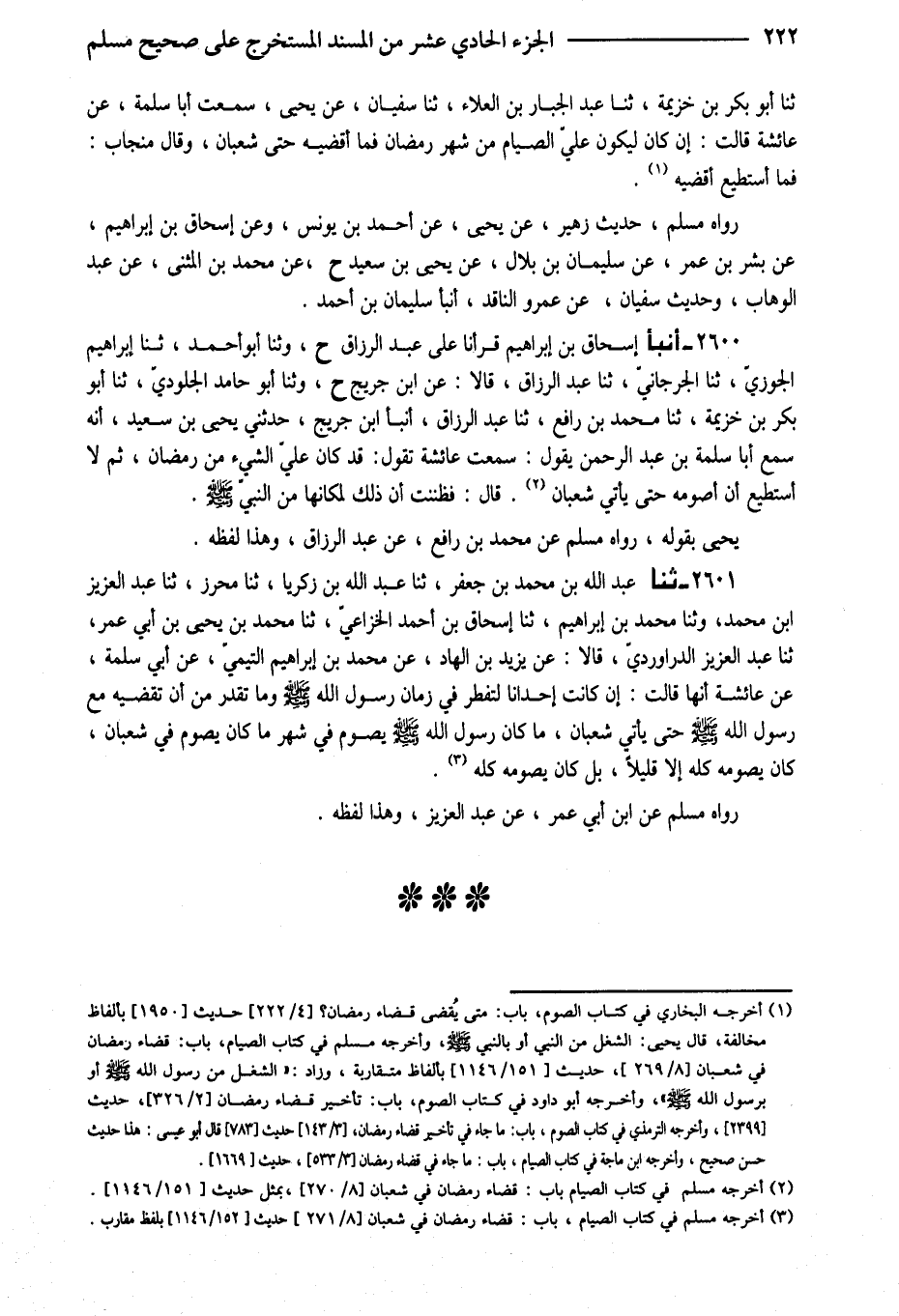 2601 - ثَنَا عَبْدُ اللَّهِ بْنُ مُحَمَّد بْنِ جَعْفَر ثَنَا عَبْدُ اللَّهِ بْنُ زَكَرِيَّا ثَنَا مُحْرِزٌ ثَنَا عبد الْعَزِيز ابْن مُحَمَّدٍ وَثنا مُحَمَّدُ بْنُ إِبْرَاهِيمَ ثَنَا إِسْحَاقُ بْنُ أَحْمَدَ الْخُزَاعِيُّ ثَنَا مُحَمَّدُ بْنُ يَحْيَى بْنِ أَبِي عُمَرَ ثَنَا عَبْدُ الْعَزِيزِ الدَّرَاوَرْدِيُّ قَالا عَنْ يَزِيدَ بْنِ الْهَادِ عَنْ مُحَمَّدِ بْنِ إِبْرَاهِيمَ التَّيْمِيِّ عَنْ أَبِي سَلَمَةَ عَنْ عَائِشَةَ أَنَّهَا قَالَتْ إِنْ كَانَتْ إِحْدَانَا لَتُفْطِرُ فِي زَمَانِ رَسُولِ اللَّهِ صَلَّى اللَّهُ عَلَيْهِ وَسَلَّمَ وَمَا تَقْدِرُ مِنْ أَنْ تَقْضِيَهُ مَعَ رَسُولِ اللَّهِ صَلَّى اللَّهُ عَلَيْهِ وَسَلَّمَ حَتَّى يَأْتِيَ شَعْبَانُ مَا كَانَ رَسُولُ اللَّهِ صَلَّى اللَّهُ عَلَيْهِ وَسَلَّمَ يَصُومُ فِي شَهْرٍ مَا كَانَ يَصُومُ فِي شَعْبَانَ كَانَ يَصُومُهُ كُلَّهُ إِلَّا قَلِيلًا بَلْ كَانَ يَصُومُهُ كُلَّهُ