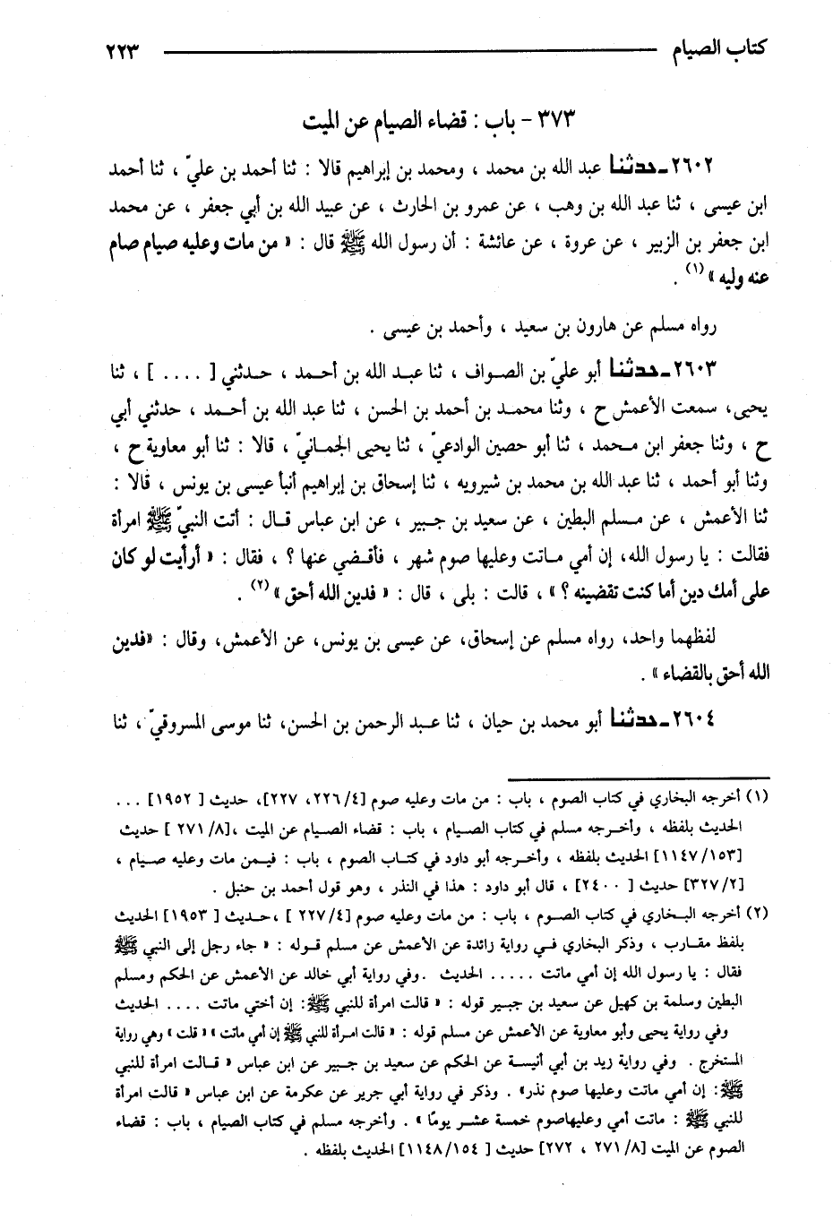 2603 - حَدَّثَنَا أَبُو عَلِيِّ بْنُ الصَّوَّافِ ثَنَا عَبْدُ اللَّهِ بْنُ أَحْمَدَ حَدَّثَنِي ثَنَا يَحْيَى سَمِعْتُ الأَعْمَشِ ح وثنا مُحَمَّدُ بْنُ أَحْمَدَ بْنِ الْحَسَنِ ثَنَا عَبْدُ اللَّهِ بْنُ أَحْمَدَ حَدَّثَنِي أَبِي ح وثنا جَعْفَر ابْن مُحَمَّدٍ ثَنَا أَبُو حُصَيْنٍ الْوَادِعِيُّ ثَنَا يَحْيَى الْجُمَّانِيُّ قَالا ثَنَا أَبُو مُعَاوِيَةَ ح وثنا أَبُو أَحْمَدَ ثَنَا عَبْدُ اللَّهِ بْنُ مُحَمَّدِ بْنِ شِيرَوَيْهِ ثَنَا إِسْحَاقُ بْنُ إِبْرَاهِيمَ أَنْبَا عِيسَى بْنُ يُونُسَ قَالا ثَنَا الأَعْمَشُ عَنْ مُسْلِمٍ الْبَطِينِ عَنْ سَعِيدِ بْنِ جُبَيْرٍ عَنِ ابْنِ عَبَّاسٍ قَالَ أَتَتِ النَّبِيَّ صَلَّى اللَّهُ عَلَيْهِ وَسَلَّمَ امْرَأَةٌ فَقَالَتْ يَا رَسُولَ اللَّهِ إِنَّ أُمِّي مَاتَتْ وَعَلَيْهَا صَوْمُ شَهْرٍ فَأَقْضِي عَنْهَا فَقَالَ أَرَأَيْتِ لَوْ كَانَ عَلَى أُمِّكِ دَيْنٌ أَمَا كُنْتِ تَقْضِينَهُ قَالَتْ بَلَى قَالَ فَدَيْنُ اللَّهِ أَحَقُّ