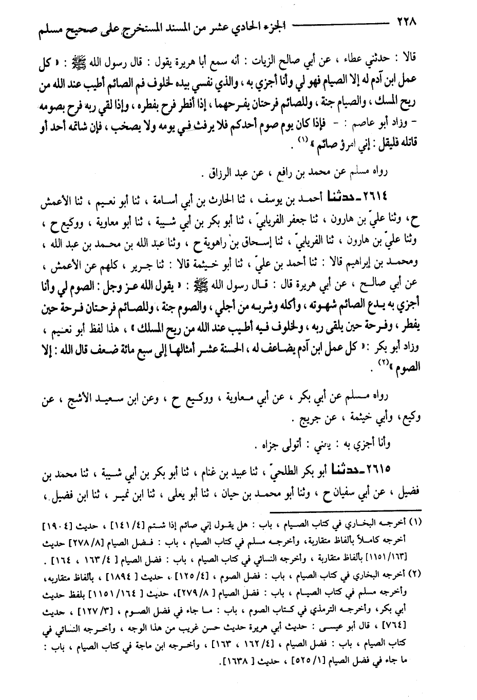 2614 - حَدَّثَنَا أَحْمَدُ بْنُ يُوسُفَ ثَنَا الْحَارِثُ بْنُ أَبِي أُسَامَةَ ثَنَا أَبُو نُعَيْمٍ ثَنَا الأَعْمَشُ ح وَثنا عَلِيُّ بْنُ هَارُونَ ثَنَا جَعْفَرٌ الْفِرْيَابِيُّ ثَنَا أَبُو بَكْرِ بْنُ أَبِي شَيْبَةَ ثَنَا أَبُو مُعَاوِيَةَ وَوَكِيعٌ ح وَثنا عَلِيُّ بْنُ هَارُونَ ثَنَا الْفِرْيَابِيُّ ثَنَا إِسْحَاقُ بْنُ رَاهَوَيْهِ ح وَثنا عَبْدُ اللَّهِ بْنُ مُحَمَّدِ بْنِ عَبْدِ اللَّهِ وَمُحَمَّدُ بْنُ إِبْرَاهِيمَ قَالا ثَنَا أَحْمَدُ بْنُ عَلِيٍّ ثَنَا أَبُو خَيْثَمَةَ قَالا ثَنَا جَرِيرٌ كُلُّهُمْ عَنِ الأَعْمَشِ عَنْ أَبِي صَالِحٍ عَنْ أَبِي هُرَيْرَةَ قَالَ قَالَ رَسُولُ اللَّهِ صَلَّى اللَّهُ عَلَيْهِ وَسَلَّمَ يَقُولُ اللَّهُ عَزَّ وَجل الصَّوْم لي وَأَنا لَا أَجْزِي بِهِ يَدَعُ الصَّائِمُ شَهْوَتَهُ وَأَكْلَهُ وَشُرْبَهُ مِنْ أَجْلِي وَالصَّوْمُ جُنَّةٌ وَلِلصَّائِمِ فَرْحَتَانِ فَرْحَةٌ حِينَ يُفْطِرُ وَفَرْحَةٌ حِينَ يَلْقَى رَبَّهُ وَلَخَلُوفُ فِيهِ أَطْيَبُ عِنْدَ اللَّهِ مِنْ رِيحِ الْمِسْكِ هَذَا لَفْظُ أَبُو نُعَيْمٍ وَزَادَ أَبُو بَكْرٍ كُلُّ عَمَلِ ابْنِ آدَمَ يُضَاعَفُ لَهُ الْحَسَنَةُ عَشْرُ أَمْثَالِهَا إِلَى سَبْعِ مِائَةِ ضِعْفٍ قَالَ اللَّهُ إِلَّا الصَّوْمَ