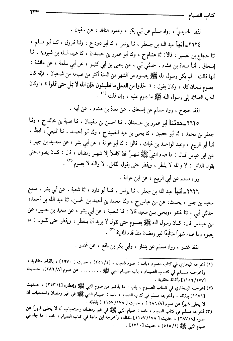 2624 - أنبا عَبْدُ اللَّهِ بْنُ جَعْفَرٍ ثَنَا يُونُسُ ثَنَا أَبُو دَاوُدَ ح وَثنا فَارُوقٌ ثَنَا أَبُو مُسْلِمٍ ثَنَا حَجَّاجُ بْنُ نَضِيرٍ قَالا ثَنَا هِشَامٌ ح وَثَنَا أَبُو عَمْرِو بْنُ حَمْدَانَ ثَنَا عُبَيْدُ اللَّهِ بْنُ شِيرَوَيْهِ ثَنَا إِسْحَاقُ أنبأ مُعَاذُ بْنُ هِشَامٍ حَدَّثَنِي أَبِي عَنْ يَحْيَى بْنِ أَبِي كَثِيرٍ عَنْ أَبِي سَلَمَةَ عَنْ عَائِشَةَ أَنَّهَا قَالَتْ لَمْ يَكُنْ رَسُولُ اللَّهِ صَلَّى اللَّهُ عَلَيْهِ وَسَلَّمَ يَصُومُ مِنَ الشَّهْرِ مِنَ السَّنَةِ أَكْثَرَ مِنْ صِيَامِهِ مِنْ شَعْبَانَ فَإِنَّهُ كَانَ يَصُومُ شَعْبَانَ كُلَّهُ وَكَانَ يَقُولُ خُذُوا مِنَ الْعَمَلِ مَا تُطِيقُونَ فَإِنَّ اللَّهَ لَا يَمَلُّ حَتَّى تَمَلُّوا وَكَانَ أَحَبُّ الصَّلاةِ إِلَى رَسُولُ اللَّهِ صَلَّى اللَّهُ عَلَيْهِ وَسَلَّمَ مَا دَاوَمَ عَلَيْهِ وَإِنْ قَلَّتْ