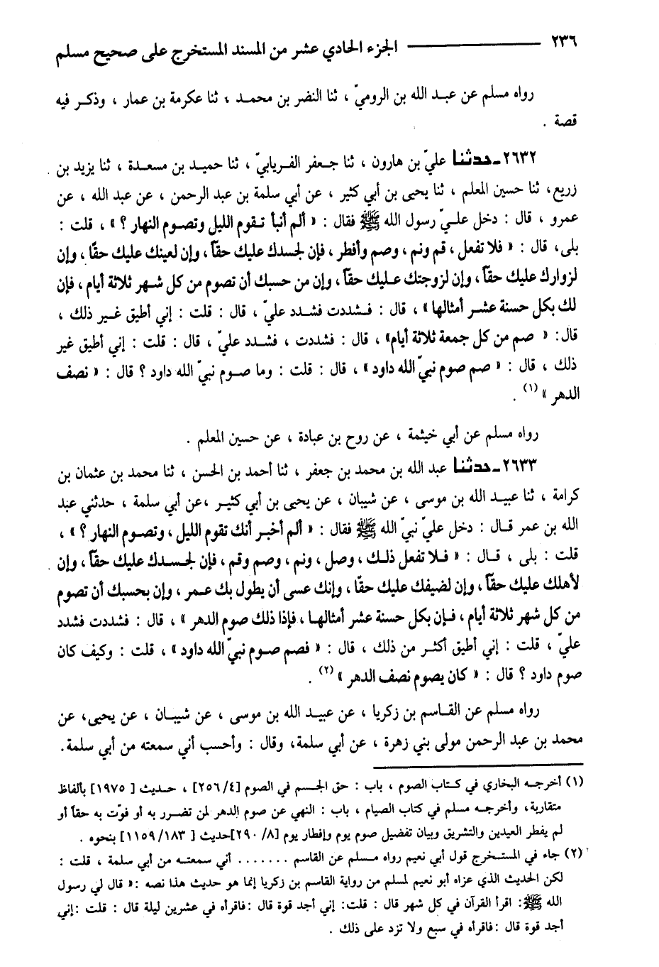 2632 - حَدَّثَنَا عَلِيُّ بْنُ هَارُونَ ثَنَا جَعْفَرٌ الْفِرْيَابِيُّ ثَنَا حُمَيْدُ بْنُ مَسْعَدَةَ ثَنَا يَزِيدُ بْنُ زُرَيْعٍ ثَنَا حُسَيْنُ الْمُعَلِّمُ ثَنَا يَحْيَى بْنُ أَبِي كَثِيرٍ عَنْ أَبِي سَلَمَةَ بْنِ عَبْدِ الرَّحْمَنِ عَنْ عَبْدِ اللَّهِ عَنْ عَمْرٍو قَالَ دَخَلَ عَلَيَّ رَسُولُ اللَّهِ صَلَّى اللَّهُ عَلَيْهِ وَسلم فَقَالَ ألم أنبأ تَقُومُ اللَّيْلَ وَتَصُومُ النَّهَارَ قُلْتُ بَلَى قَالَ فَلا تَفْعَلْ قُمْ وَنَمْ وَصُمْ وَأَفْطِرْ فَإِنَّ لِجَسَدِكَ عَلَيْكَ حَقًّا وَإِنَّ لِعَيْنِكَ عَلَيْكَ حَقًا وَإِن لزوارك عَلَيْكَ حَقًّا وَإِنَّ لِزَوْجَتِكَ عَلَيْكَ حَقًّا وَإِنَّ مِنْ حَسْبِكَ أَنْ تَصُومَ مِنْ كُلِّ شَهْرٍ ثَلاثَةَ أَيَّامٍ فَإِنَّ لَكَ بِكُلِّ حَسَنَةٍ عَشْرَ أَمْثَالِهَا قَالَ فَشَدَّدْتُ فَشُدِّدَ عَلَيَّ قَالَ قُلْتُ إِنِّي أُطِيقُ غَيْرَ ذَلِكَ قَالَ صُمْ مِنْ كُلِّ جُمُعَةٍ ثَلاثَةَ أَيَّامٍ قَالَ فشدتت فَشُدِّدَ عَلَيَّ قَالَ قُلْتُ إِنِّي أُطِيقُ غَيْرَ ذَلِكَ قَالَ صُمْ صَوْمَ نَبِيِّ اللَّهِ دَاوُدَ قَالَ قُلْتُ وَمَا صَوْمُ نَبِيِّ اللَّهِ دَاوُدَ قَالَ نِصْفُ الدَّهْرِ