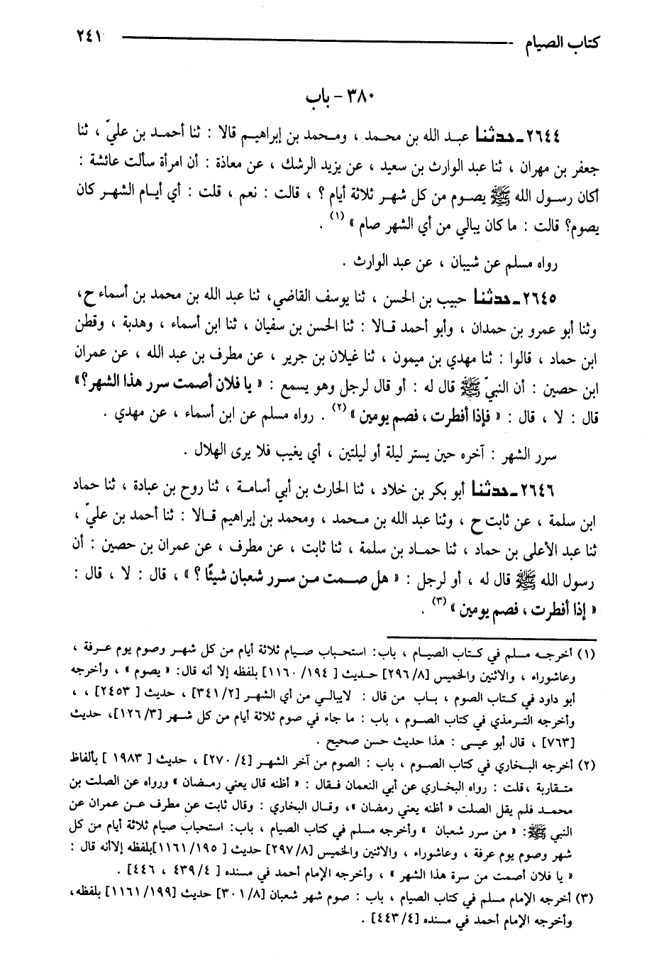 2645 - حَدَّثَنَا حَبِيبُ بْنُ الْحَسَنِ ثَنَا يُوسُفُ الْقَاضِي ثَنَا عَبْدُ اللَّهِ بْنُ مُحَمَّدِ بْنِ أَسْمَاءَ ح وَثنا أَبُو عَمْرِو بْنُ حَمْدَانَ وَأَبُو أَحْمَدَ قَالا ثَنَا الْحَسَنُ بْنُ سُفْيَان ثَنَا ابْنُ أَسْمَاءَ وَهُدْبَةُ وَقَطَنُ ابْن حَمَّادٍ قَالُوا ثَنَا مَهْدِيُّ بْنُ مَيْمُونَ ثَنَا غَيْلانُ بْنُ جَرِيرٍ عَنْ مُطَرِّفِ بْنِ عَبْدِ اللَّهِ عَن عمرَان ابْن حُصَيْنٍ أَنَّ النَّبِيَّ صَلَّى اللَّهُ عَلَيْهِ وَسَلَّمَ قَالَ لَهُ أَوْ قَالَ لِرَجُلٍ وَهُوَ يَسْمَعُ يَا فُلانُ أَصُمْتَ سُرَرَ هَذَا الشَّهْرِ قَالَ لَا قَالَ فَإِذَا أَفْطَرْتَ فَصُمْ يَوْمَيْنِ