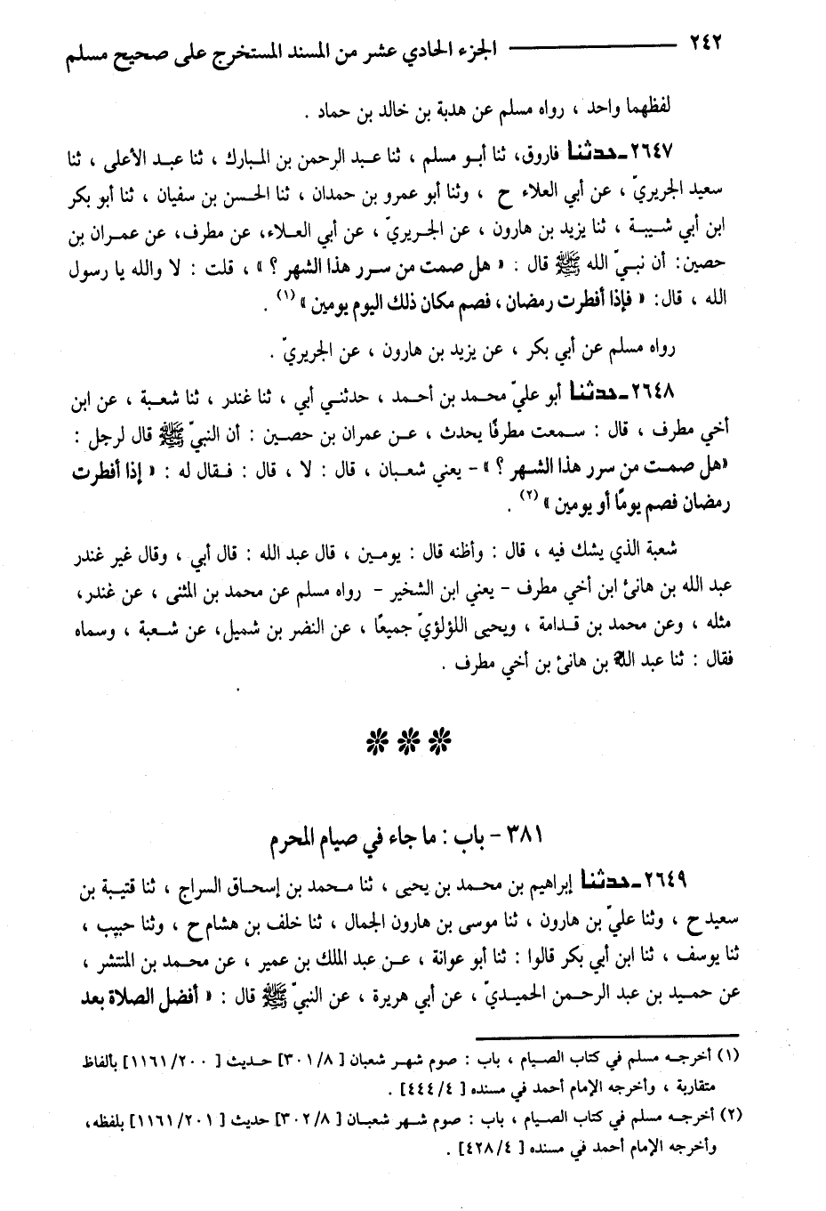 2647 - حَدَّثَنَا فَارُوقٌ ثَنَا أَبُو مُسْلِمٍ ثَنَا عَبْدُ الرَّحْمَنِ بْنُ الْمُبَارَكِ ثَنَا عَبْدُ الأَعْلَى ثَنَا سَعِيدٌ الْجُرَيْرِيُّ عَنْ أَبِي الْعَلاءِ ح وثنا أَبُو عَمْرِو بْنُ حَمْدَانَ ثَنَا الْحَسَنُ بْنُ سُفْيَانَ ثَنَا أَبُو بكر ابْن أَبِي شَيْبَةَ ثَنَا يَزِيدُ بْنُ هَارُونَ عَنِ الْجُرَيْرِيِّ عَنْ أَبِي الْعَلاءِ عَنْ مُطَرِّفٍ عَنْ عِمْرَانَ بْنِ حُصَيْنٍ أَنَّ نَبِيَّ اللَّهِ صَلَّى اللَّهُ عَلَيْهِ وَسَلَّمَ قَالَ هَلْ صُمْتَ مِنْ سُرَرِ هَذَا الشَّهْرِ قُلْتُ لَا وَاللَّهِ يَا رَسُولَ اللَّهِ قَالَ فَإِذَا أَفْطَرْتَ رَمَضَانَ فَصُمْ مَكَانَ ذَلِكَ الْيَوْمِ يَوْمَيْنِ