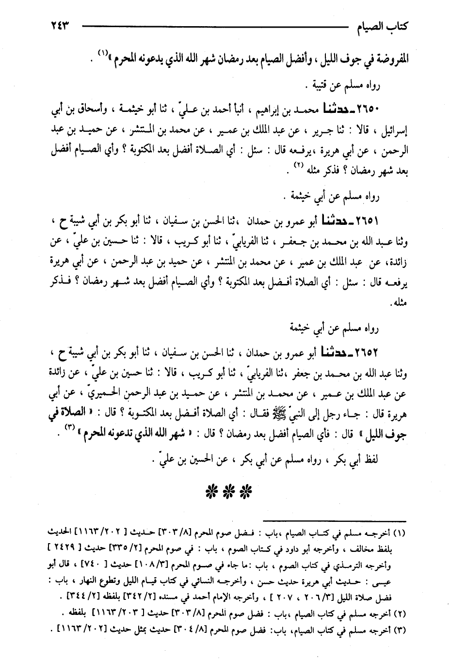 2652 - حَدَّثَنَا أَبُو عَمْرِو بْنُ حَمْدَانَ ثَنَا الْحَسَنُ بْنُ سُفْيَانَ ثَنَا أَبُو بَكْرِ بْنُ أَبِي شَيْبَةَ ح وَثَنَا عَبْدُ اللَّهِ بْنُ مُحَمَّدُ بْنُ جَعْفَرٍ ثَنَا الْفِرْيَابِيُّ ثَنَا أَبُو كُرَيْبٍ قَالا ثَنَا حُسَيْنُ بْنُ عَلِيٍّ عَنْ زَائِدَةَ عَنْ عَبْدِ الْمَلِكِ بْنِ عُمَيْرٍ عَنْ مُحَمَّدِ بْنِ الْمُنْتَشِرِ عَنْ حُمَيْدِ بْنِ عَبْدِ الرَّحْمَنِ الْحِمْيَرِيِّ عَنْ أَبِي هُرَيْرَةَ قَالَ جَاءَ رَجُلٌ إِلَى النَّبِيِّ صَلَّى اللَّهُ عَلَيْهِ وَسَلَّمَ فَقَالَ أَيُّ الصَّلاةِ أَفْضَلُ بَعْدَ الْمَكْتُوبَةِ قَالَ الصَّلاةُ فِي جَوْفِ اللَّيْلِ قَالَ فَأَيُّ الصِّيَامِ أَفْضَلُ بَعْدَ رَمَضَانَ قَالَ شَهْرُ اللَّهِ الَّذِي تَدْعُونَهُ الْمُحَرَّمَ