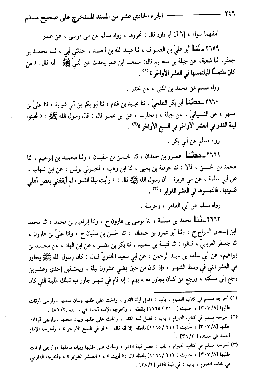 2659 - ثَنَا أَبُو عَلِيِّ بْنُ الصَّوَّافِ ثَنَا عَبْدُ اللَّهِ بْنُ أَحْمَدَ حَدَّثَنِي أَبِي ثَنَا مُحَمَّدُ بْنُ جَعْفَرٍ ثَنَا شُعْبَةُ عَنْ جَبَلَةَ بْنِ سُحَيْمٍ قَالَ سَمِعْتُ ابْنَ عُمَرَ يُحَدِّثُ عَنِ النَّبِيِّ صَلَّى اللَّهُ عَلَيْهِ وَسَلَّمَ أَنَّهُ قَالَ مَنْ كَانَ مُلْتَمِسًا فَلْيَلْتَمِسْهَا فِي الْعَشْرِ الأَوَاخِرِ