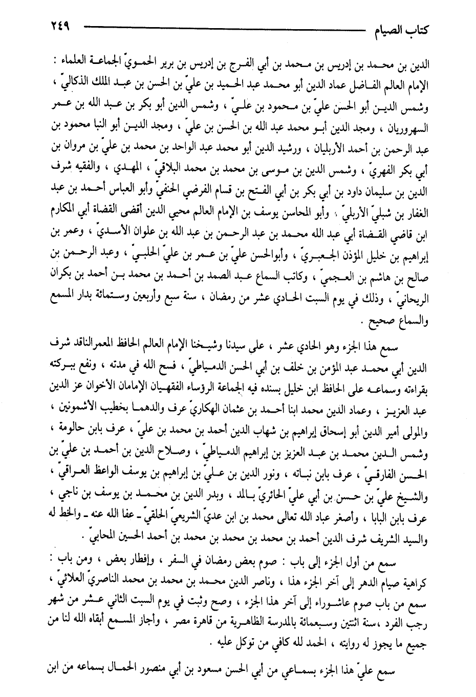 الدَّين بن مُحَمَّد بن إِدْرِيس بن مُحَمَّد بن أبي الْفرج بن إِدْرِيس بن برير الْحَمَوِيّ الْجَمَاعَة الْعلمَاء الإِمَام الْعَالم الْفَاضِل عماد الدَّين أَبُو مُحَمَّد عبد الحميد بْنُ عَلِيِّ بْنِ الْحَسَنِ بْنِ عبد الْملك الذكالي وشمس الدَّين أَبُو الْحسن عَليّ بن مَحْمُود بن عَليّ وشمس الدَّين أَبُو بَكْرِ بْنِ عَبْدِ اللَّهِ بْنِ عمر السهروريان ومجد الدَّين أَبُو مُحَمَّدٍ عَبْدُ اللَّهِ بْنُ الْحسن بن عَليّ ومجد الدَّين أَبُو النبا مَحْمُود بن عبد الرَّحْمَن بن أَحْمد الأربليان ورشيد الدَّين أَبُو مُحَمَّد عبد الْوَاحِد بن مُحَمَّد بن عَليّ بن مَرْوَان بن أبي بكر الفِهري وشمس الدَّين بن مُوسَى بن مُحَمَّد بن مُحَمَّد البلاقي الْمهْدي وَالْفِقْه شرف الدَّين بن سُلَيْمَان دَاوُد بْنَ أَبِي بَكْرِ بْنِ أَبِي الْفَتْح بن قسام الفرضي الْحَنَفِيّ وَأَبُو الْعَبَّاس أَحْمد بن عبد الْغفار بن شبلي الأربلي وابو المحاسن يُوسُف بن الإِمَام الْعَالم محيي الدَّين أقضى الْقُضَاة أبي المكارم ابْن قَاضِي الْقُضَاة أبي عبد الله مُحَمَّدُ بْنُ عَبْدِ الرَّحْمَنِ بْنِ عبد الله بن علوان الْأَسدي وَعمر بن إِبْرَاهِيم بن خَلِيل الْمُؤَذّن الجعبري وَأَبُو الْحسن عَليّ بن عمر بن عَليّ الْحلَبِي وَعبد الرَّحْمَن بن صَالح بن هَاشم بن العجمي وَكَاتب السماع عبد الصَّمد بْنُ أَحْمَدَ بْنِ مُحَمَّدِ بْنِ مُحَمَّد بن أَحْمد بن بكران الريحاني وَذَلِكَ فِي يَوْم السبت الْحَادِي عشر من رَمَضَان سنة سبع وَأَرْبَعين وسِتمِائَة بدار المسمع وَالسَّمَاع صَحِيح