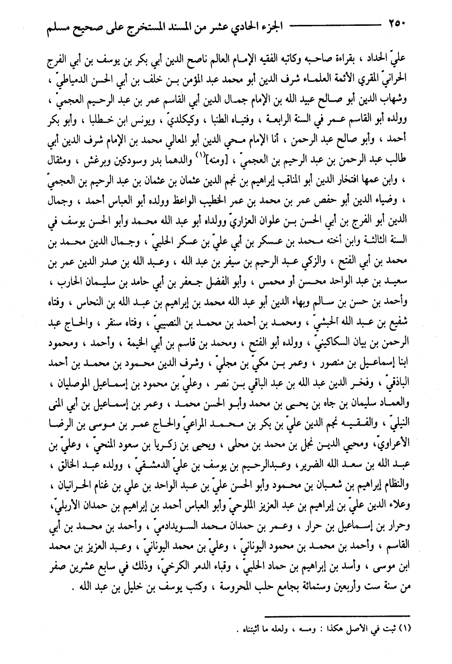 عَليّ الْحداد بِقِرَاءَة صَاحبه وكاتبه الْفَقِيه الإِمَامِ الْعَالِمِ نَاصِحِ الدِّينِ أَبِي بكر بن يُوسُف ابْن أبي الْفرج الْحَرَّانِي الْمقري الْأَئِمَّة الْعلمَاء شرف الدَّين أَبُو مُحَمَّد عبد الْمُؤمن بن خلف بن أبي الْحسن الدمياطي وشهاب الدَّين أَبُو صَالح عبيد الله ابْن الإِمَام جمال الدَّين أبي الْقَاسِم عمر بن عبد الرَّحِيم العجمي وَولده أَبُو الْقَاسِم عمر فِي السّنة الرَّابِعَة وفتياه الطنبا وكيكلدي وَيُونُس ابْن خطلبا وَأَبُو بكر أَحْمد وَأَبُو صَالح عبد الرَّحْمَن أَنا الإِمَام مُحي الدَّين أَبُو الْمَعَالِي مُحَمَّد بن الإِمَام شرف الدَّين أبي طَالب عَبْدُ الرَّحْمَنِ بْنُ عَبْدِ الرَّحِيمِ بن العجمي وَمِنْه والدهما بدر وسودكين وبرغش ومثقال وَابْن عَمها افتخار الدَّين أَبُو المناقب إِبْرَاهِيم بن نجم الدَّين عُثْمَان بن عُثْمَان بن عبد الرَّحِيم بن العجمي وضياء الدَّين أَبُو حَفْصٍ عُمَرُ بْنُ مُحَمَّدِ بن عمر الْخَطِيب الْوَاعِظ وَولده أَبُو الْعَبَّاس أَحْمد وجمال الدَّين أَبُو الْفرج بن أبي الْحسن بن علوان العزاري وولداه أَبُو عبد الله مُحَمَّد وَأَبُو الْحسن يُوسُف فِي السّنة الثَّالِثَة وَابْن أُخْته مُحَمَّد بن عَسْكَر بن أبي عَليّ بن عَسْكَر الْحلَبِي وجمال الدَّين مُحَمَّد بن مُحَمَّد بن أبي الْفَتْح والزكي عبد الرَّحِيم بن سيفر بن عبد الله وَعبد الله بن صدر الدَّين عمر كبن سعيد بن عبد الْوَاحِد محسن أَو محمس وَأَبُو الْفضل جَعْفَر بن أبي حَامِد بن سُلَيْمَان الحارب وَأحمد بن حسن بن سَالم وبهاء الدَّين أَبُو عَبْدِ اللَّهِ مُحَمَّدُ بْنُ إِبْرَاهِيمُ بْنُ عَبْدِ اللَّهِ بْنِ النّحاس وفتاه شَفِيع بن عبد الله الحبشي وَمُحَمّد بْنُ أَحْمَدَ بْنِ مُحَمَّدِ بْنِ النصيبي وفتاه سنقر والحاج عبد الرَّحْمَن بن بَيَان السكاكيني وَولده أَبُو الْفَتْح وَمُحَمّد بن قَاسم بن أبي الْخَيْمَة وَأحمد ومحمود ابْنا إِسْمَاعِيل بن مَنْصُور وَعمر بن مكي بن مجلي وَشرف الدَّين مَحْمُود بن مُحَمَّد بن أَحْمد الباذقي وفخر الدَّين عبد الله بن عبد الْبَاقِي بن نصر وَعلي بن مَحْمُود بن إِسْمَاعِيل الموصليان والعماد سُلَيْمَان بن جاه بن يحيى بن مُحَمَّد وَأَبُو الْحسن مُحَمَّد وَعمر بن إِسْمَاعِيل بن أبي المنى النيلي والفقيه نجم الدَّين عَليّ بن بكر بن مُحَمَّد المراعي والحاج عمر بن مُوسَى بن الرِّضَا الأعراوي ومحيي الدَّين نجل بن مُحَمَّد بن محلى وَيحيى بن زَكَرِيَّا بن سعود المنحي وَعلي بْنِ عَبْدِ اللَّهِ بْنِ سَعْدٍ الله الضَّرِير وَعبد الرَّحِيم بن يُوسُف بن عَليّ الدِّمَشْقِي وَولده عبد الْخَالِق والنظام إِبْرَاهِيم بن شعْبَان بن مَحْمُود وابو الْحسن عَليّ بن عبد الْوَاحِد بن عَليّ بن غَنَّام الحرانيان وعلاء الدَّين عَليّ بن إِبْرَاهِيم بن عبد الْعَزِيز الملوحي وَأَبُو الْعَبَّاسِ أَحْمَدُ بْنُ إِبْرَاهِيمَ بْنِ حمدَان الأربلي وحرار بن إِسْمَاعِيل بن حرار وَعمر بن حمدَان مُحَمَّد السويدادمي وَأحمد بن مُحَمَّد بن أبي الْقَاسِم وَأحمد بن مُحَمَّد بن مَحْمُود اليوناني وَعلي بن مُحَمَّد اليوناني وَعبد الْعَزِيز بن مُحَمَّد ابْن مُوسَى وَأسد بن إِبْرَاهِيم بن حَمَّاد الْحلَبِي وقباء الدمر الْكَرْخِي وَذَلِكَ فِي سَابِع عشْرين صفر من سنة سِتّ وَأَرْبَعين وسِتمِائَة بِجَامِع حلب المحروسة وَكتب يُوسُف بن خَلِيل بن عبد الله
