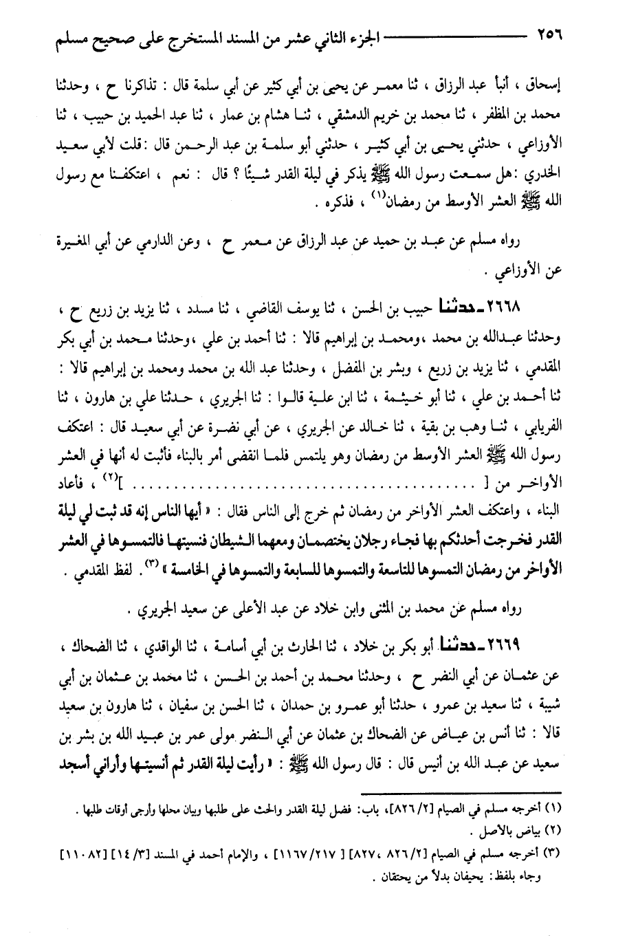 2668 - حَدَّثَنَا حَبِيبُ بْنُ الْحَسَنِ ثَنَا يُوسُفُ الْقَاضِي ثَنَا مُسَدَّدٌ ثَنَا يَزِيدُ بْنُ زُرَيْعٍ ح وَحَدَّثَنَا عَبْدُ اللَّهِ بْنُ مُحَمَّدٍ وَمُحَمَّدُ بْنُ إِبْرَاهِيمَ قَالا ثَنَا أَحْمَدُ بن عَليّ وَحدثنَا مُحَمَّدُ بْنُ أَبِي بَكْرٍ الْمُقَدِّمِيُّ ثَنَا يَزِيدُ بْنُ زُرَيْعٍ وَبِشْرُ بْنُ الْمُفَضَّلِ وَحَدَّثَنَا عَبْدُ اللَّهِ بْنُ مُحَمَّدٍ وَمُحَمَّدُ بْنُ إِبْرَاهِيمَ قَالا ثَنَا أَحْمَدُ بْنُ عَلِيٍّ ثَنَا أَبُو خَيْثَمَةَ ثَنَا ابْنُ عُلَيَّةَ قَالُوا ثَنَا الْجُرَيْرِيُّ حَدَّثَنَا عَلِيُّ بْنُ هَارُونَ ثَنَا الْفِرْيَابِيُّ ثَنَا وَهْبُ بْنُ بَقِيَّةَ ثَنَا خَالِدٌ عَنِ الْجُرَيْرِيِّ عَنْ أَبِي نَضْرَةَ عَنْ أَبِي سَعِيدٍ قَالَ اعْتَكَفَ رَسُولُ اللَّهِ صَلَّى اللَّهُ عَلَيْهِ وَسلم الْعشْر الأسط مِنْ رَمَضَانَ وَهُوَ يَلْتَمِسُ فَلَمَّا انْقَضَى أَمَرَ بِالْبِنَاءِ فَأُثْبِتَ لَهُ أَنَّهَا فِي الْعَشْرِ الأَوَاخِرِ مِنْ فَأَعَادَ الْبِنَاءَ وَاعْتَكَفَ الْعَشْرَ الأَوَاخِرَ مِنْ رَمَضَانَ ثُمَّ خَرَجَ إِلَى النَّاسِ فَقَالَ أَيُّهَا النَّاسُ إِنَّهُ قد ثَبت لِي لَيْلَةُ الْقَدْرِ فَخَرَجْتُ أُحَدِّثُكُمْ بِهَا فَجَاءَ رَجُلانِ يَخْتَصِمَانِ وَمَعَهُمَا الشَّيْطَانُ فَنُسِّيتُهَا فَالْتَمِسُوهَا فِي الْعَشْرِ الأَوَاخِرِ مِنْ رَمَضَانَ الْتَمِسُوهَا لِلتَّاسِعَةِ وَالْتَمِسُوهَا لِلسَّابِعَةِ وَالْتَمِسُوهَا فِي الْخَامِسَةِ