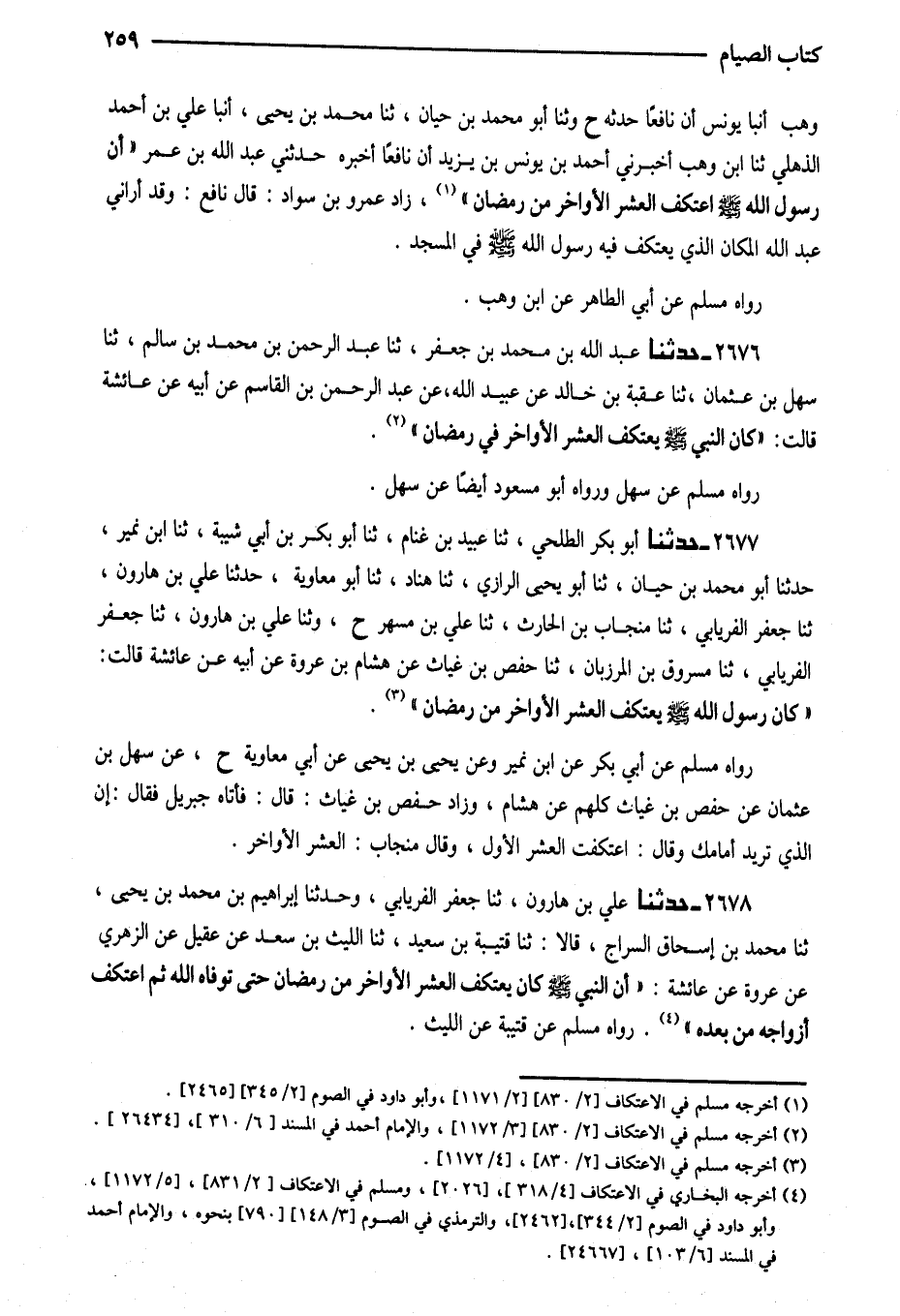 2677 - حَدَّثَنَا أَبُو بَكْرٍ الطَّلْحِيُّ ثَنَا عُبَيْدُ بْنُ غَنَّامٍ ثَنَا أَبُو بَكْرِ بْنُ أَبِي شَيْبَةَ ثَنَا ابْنُ نُمَيْرٍ حَدَّثَنَا أَبُو مُحَمَّدِ بْنُ حَيَّانَ ثَنَا أَبُو يَحْيَى الرَّازِيُّ ثَنَا هَنَّادٌ ثَنَا أَبُو مُعَاوِيَةَ حَدَّثَنَا عَلِيُّ بْنُ هَارُونَ ثَنَا جَعْفَرٌ الْفِرْيَابِيُّ ثَنَا مِنْجَابٌ بْنُ الْحَارِثِ ثَنَا عَلِيُّ بْنُ مُسْهِرٍ ح وَثنا عَلِيُّ بْنُ هَارُونَ ثَنَا جَعْفَرٌ الْفِرْيَابِيُّ ثَنَا مَسْرُوقُ بْنُ الْمَرْزُبَانِ ثَنَا حَفْصُ بْنُ غِيَاثٍ عَنْ هِشَامِ بْنِ عُرْوَةَ عَنْ أَبِيهِ عَنْ عَائِشَةَ قَالَتْ كَانَ رَسُولُ اللَّهِ صَلَّى اللَّهُ عَلَيْهِ وَسَلَّمَ يَعْتَكِفُ الْعَشْرَ الأَوَاخِرِ مِنْ رَمَضَانَ
