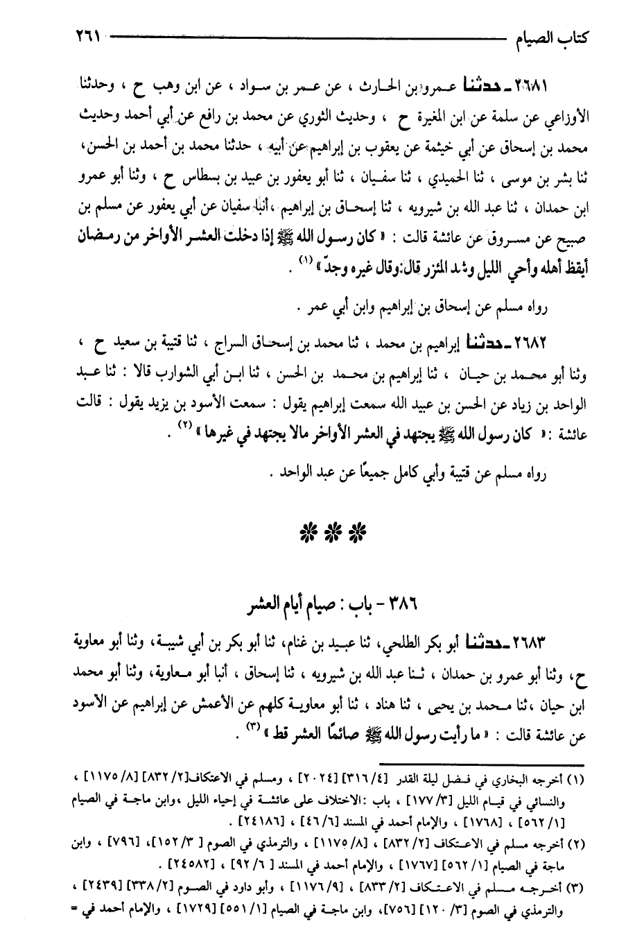 2683 - حَدَّثَنَا أَبُو بَكْرٍ الطَّلْحِيُّ ثَنَا عُبَيْدُ بْنُ غَنَّامٍ ثَنَا أَبُو بَكْرِ بْنُ أَبِي شَيْبَةَ وثنا أَبُو مُعَاوِيَةَ ح وثنا أَبُو عُمَرَ بْنُ حَمْدَانَ ثَنَا عَبْدُ اللَّهِ بْنُ شِيرَوَيْهِ ثَنَا إِسْحَاقُ أَنْبَأَ أَبُو مُعَاوِيَةَ وَثنا أَبُو مُحَمَّد ابْنُ حَيَّانَ ثَنَا مُحَمَّدُ بْنُ يَحْيَى ثَنَا هَنَّادٌ ثَنَا أَبُو مُعَاوِيَةَ كُلُّهُمْ عَنِ الأَعْمَشِ عَنْ إِبْرَاهِيمَ عَنِ الأَسْوَدِ عَنْ عَائِشَةَ قَالَتْ مَا رَأَيْتُ رَسُولَ اللَّهِ صَلَّى اللَّهُ عَلَيْهِ وَسَلَّمَ صَائِمًا الْعَشْرَ قَطُّ