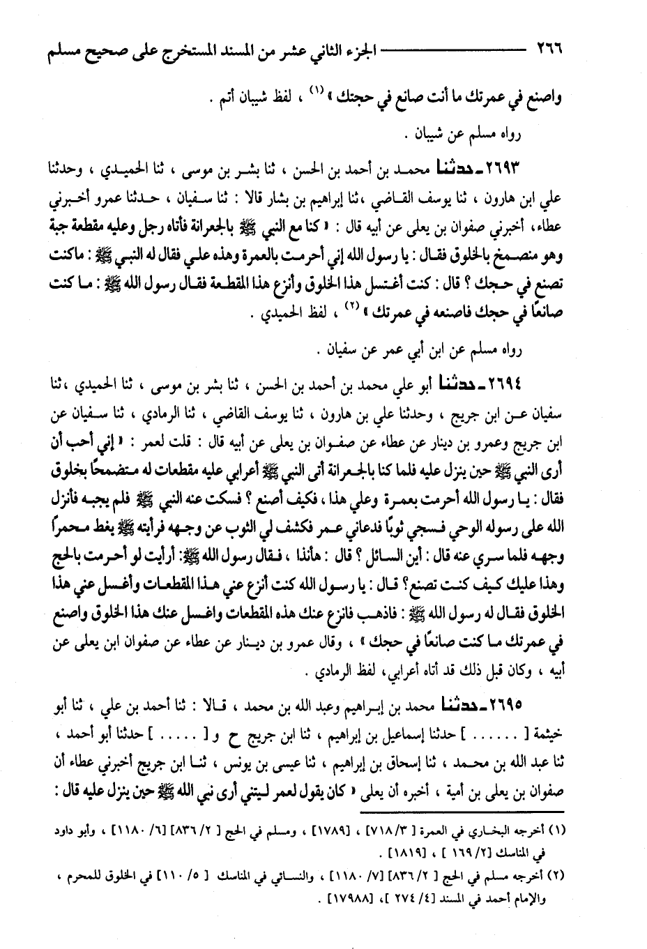 2693 - حَدَّثَنَا مُحَمَّدُ بْنُ أَحْمَدَ بْنِ الْحَسَنِ ثَنَا بِشْرُ بْنُ مُوسَى ثَنَا الْحميدِي وَحدثنَا عَليّ ابْن هَارُونَ ثَنَا يُوسُفُ الْقَاضِي ثَنَا إِبْرَاهِيمُ بْنُ بَشَّارٍ قَالا ثَنَا سُفْيَانُ حَدَّثَنَا عَمْرٌو أَخْبَرَنِي عَطَاءٌ أَخْبَرَنِي صَفْوَانُ بْنُ يَعْلَى عَنْ أَبِيهِ قَالَ كُنَّا مَعَ النَّبِيِّ صَلَّى اللَّهُ عَلَيْهِ وَسَلَّمَ بِالْجِعْرَانَةِ فَأَتَاهُ رجل وَعَلِيهِ مقطعَة جُبَّة وَهُوَ منصمخ بِالْخَلُوقِ فَقَالَ يَا رَسُولَ اللَّهِ إِنِّي أَحْرَمْتُ بِالْعُمْرَةِ وَهَذِهِ عَلَيَّ فَقَالَ لَهُ النَّبِيُّ صَلَّى اللَّهُ عَلَيْهِ وَسَلَّمَ مَا كُنْتَ تَصْنَعُ فِي حَجِّكَ قَالَ كُنْتُ أَغْتَسِلُ هَذَا الخلوق وأنزع هَذَا الْمُقَطَّعَةَ فَقَالَ رَسُولُ اللَّهِ صَلَّى اللَّهُ عَلَيْهِ وَسَلَّمَ مَا كُنْتَ صَانِعًا فِي حَجِّكَ فَاصْنَعْهُ فِي عُمْرَتِكَ لَفْظُ الْحُمَيْدِيِّ