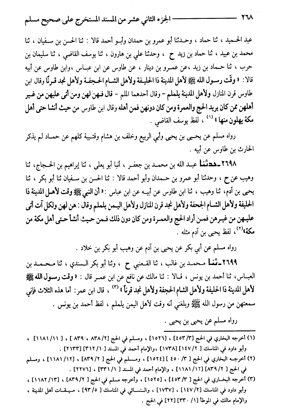 2698 - حَدَّثَنَا عَبْدُ اللَّهِ بْنُ مُحَمَّدِ بْنِ جَعْفَرٍ أنبا أَبُو يَعْلَى ثَنَا إِبْرَاهِيمُ بْنُ الْحَجَّاجِ ثَنَا وُهَيْبٌ عَنِ ح وَحَدَّثَنَا أَبُو عَمْرِو بْنُ حَمْدَانَ وَأَبُو أَحْمَدَ قَالا ثَنَا الْحَسَنُ بْنُ سُفْيَانَ ثَنَا أَبُو بَكْرٍ ثَنَا يَحْيَى بْنُ آدَمَ ثَنَا وُهَيْبٌ ثَنَا ابْنُ طَاوُسٍ عَنْ أَبِيهِ عَنِ ابْنِ عَبَّاسٍ إِنَّ النَّبِيَّ صَلَّى اللَّهُ عَلَيْهِ وَسَلَّمَ وَقَّتَ لِأَهْلِ الْمَدِينَةِ ذَا الْحُلَيْفَةِ وَلِأَهْلِ الشَّامِ الْجُحْفَةَ وَلِأَهْلِ نَجْدٍ قَرْنَ الْمَنَازِلِ وَلِأَهْلِ الْيَمَنِ يَلَمْلَمَ وَقَالَ هُنَّ لَهُنَّ وَلِكُلِّ آتٍ أَتَى عَلَيْهِنَّ مِنْ غَيْرِهِنَّ فَمَنْ أَرَادَ الْحَجَّ وَالْعُمْرَةَ وَمَنْ كَانَ دُونَ ذَلِكَ فَمِنْ حَيْثُ أَنْشَأَ حَتَّى أَهْلُ مَكَّةَ مِنْ مَكَّةَ لَفْظُ يَحْيَى بْنِ آدَمَ مِثْلَهُ