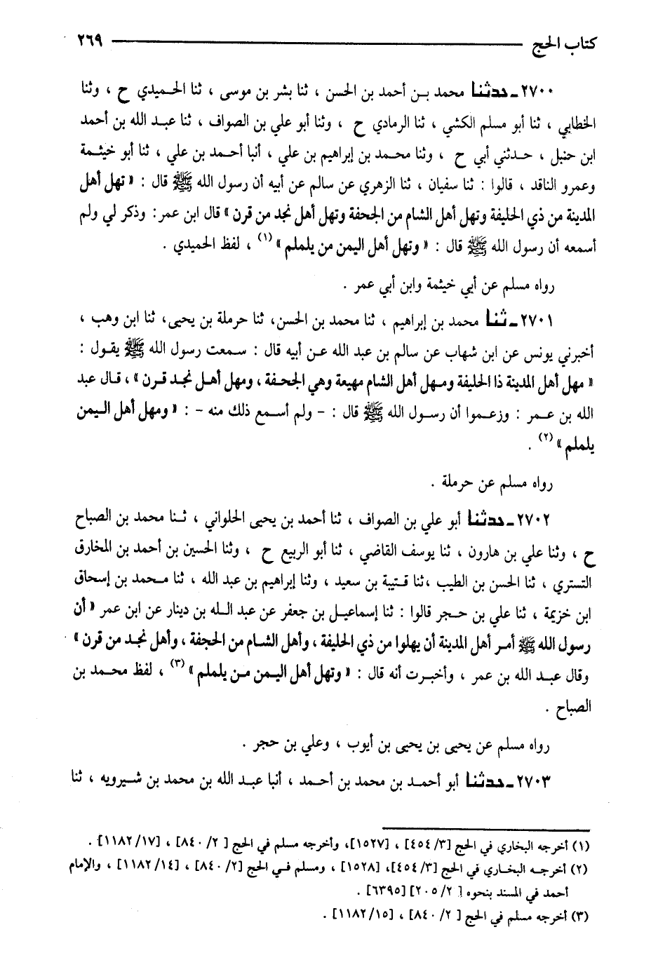 2700 - حَدَّثَنَا مُحَمَّدُ بْنُ أَحْمَدَ بْنِ الْحَسَنِ ثَنَا بِشْرُ بْنُ مُوسَى ثَنَا الْحُمَيْدِيُّ ح وَثَنَا الْخَطَّابِيُّ ثَنَا أَبُو مُسْلِمٍ الْكَشِّيُّ ثَنَا الرَّمَادِيُّ ح وَثنا أَبُو عَلِيِّ بْنُ الصَّوَّافِ ثَنَا عَبْدُ اللَّهِ بْنُ أَحْمَدَ بْنِ حَنْبَلٍ حَدَّثَنِي أَبِي ح وَثنا مُحَمَّدُ بْنُ إِبْرَاهِيمَ بْنِ عَلِيٍّ أنبا أَحْمَدُ بْنُ عَلِيٍّ ثَنَا أَبُو خَيْثَمَةَ وَعَمْرٌو النَّاقِدُ قَالُوا ثَنَا سُفْيَانُ ثَنَا الزُّهْرِيُّ عَنْ سَالِمٍ عَنْ أَبِيهِ أَنَّ رَسُولَ اللَّهِ صَلَّى اللَّهُ عَلَيْهِ وَسَلَّمَ قَالَ تهل أَهْلُ الْمَدِينَةِ مِنْ ذِي الْحُلَيْفَةِ وتهل أهل الشَّام من الْجحْفَة وتهل أَهْلُ نَجْدٍ مِنْ قَرْنٍ قَالَ ابْنُ عُمَرَ وَذُكِرَ لِي وَلَمْ أَسْمَعْهُ أَنَّ رَسُولَ اللَّهِ صَلَّى الله عَلَيْهِ وَسلم قَالَ وَتُهِلُّ أَهْلُ الْيَمَنِ مِنْ يَلَمْلَمَ لَفْظُ الْحُمَيْدِيِّ