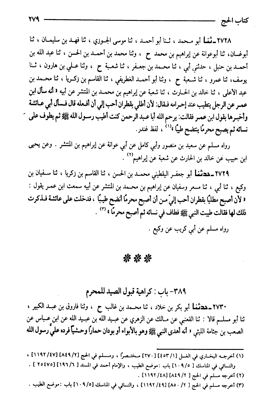 2728 - ثَنَا أَبُو مُحَمَّد ثَنَا أَبُو أَحْمَدَ ثَنَا مُوسَى الْجُوزِيُّ ثَنَا فَهْدُ بْنُ سُلَيْمَانَ ثَنَا أَبُو غَسَّانَ ثَنَا أَبُو عَوَانَةَ عَنْ إِبْرَاهِيمَ بْنِ مُحَمَّدٍ ح وثنا مُحَمَّدُ بْنُ أَحْمَدَ بْنِ الْحَسَنِ ثَنَا عَبْدُ اللَّهِ بْنُ أَحْمَدَ بْنِ حَنْبَلٍ حَدَّثَنِي أَبِي ثَنَا مُحَمَّدُ بْنُ جَعْفَرٍ ثَنَا شُعْبَةُ ح وَثنا عَلِيُّ بْنُ هَارُونَ ثَنَا يُوسُفُ ثَنَا عَمْرٌو ثَنَا شُعْبَةُ ح وَثنا أَبُو أَحْمَدَ الْغِطْرِيفِيُّ ثَنَا الْقَاسِمُ بْنُ زَكَرِيَّا ثَنَا مُحَمَّدُ بْنُ عَبْدِ الأَعْلَى ثَنَا خَالِدُ بْنُ الْحَارِثِ ثَنَا شُعْبَةُ عَنْ إِبْرَاهِيمَ بْنِ مُحَمَّدِ بْنِ الْمُنْتَشِرِ عَنْ أَبِيهِ أَنَّهُ سَألَ ابْنَ عُمَرَ عَنِ الرَّجُلِ يَتَطَيَّبُ عِنْدَ إِحْرَامِهِ فَقَالَ لَأَنْ أَطَّلِيَ بِقَطِرَانٍ أَحَبُّ إِلَيَّ أَنْ أَفْعَلَهُ قَالَ فَسَأَلَ أَبِي عَائِشَةَ وَأَخْبَرَهَا بِقَوْلِ ابْنِ عُمَرَ فَقَالَتْ يَرْحَمُ اللَّهُ أَبَا عَبْدِ الرَّحْمَنِ كُنْتُ أُطَيِّبُ رَسُولَ اللَّهِ صَلَّى اللَّهُ عَلَيْهِ وَسَلَّمَ ثُمَّ يَطُوفُ عَلَى نِسَائِهِ ثُمَّ يُصْبِحُ مُحْرِمًا يَنْتَضِحُ طِيبًا لَفْظُ غُنْدَرٍ