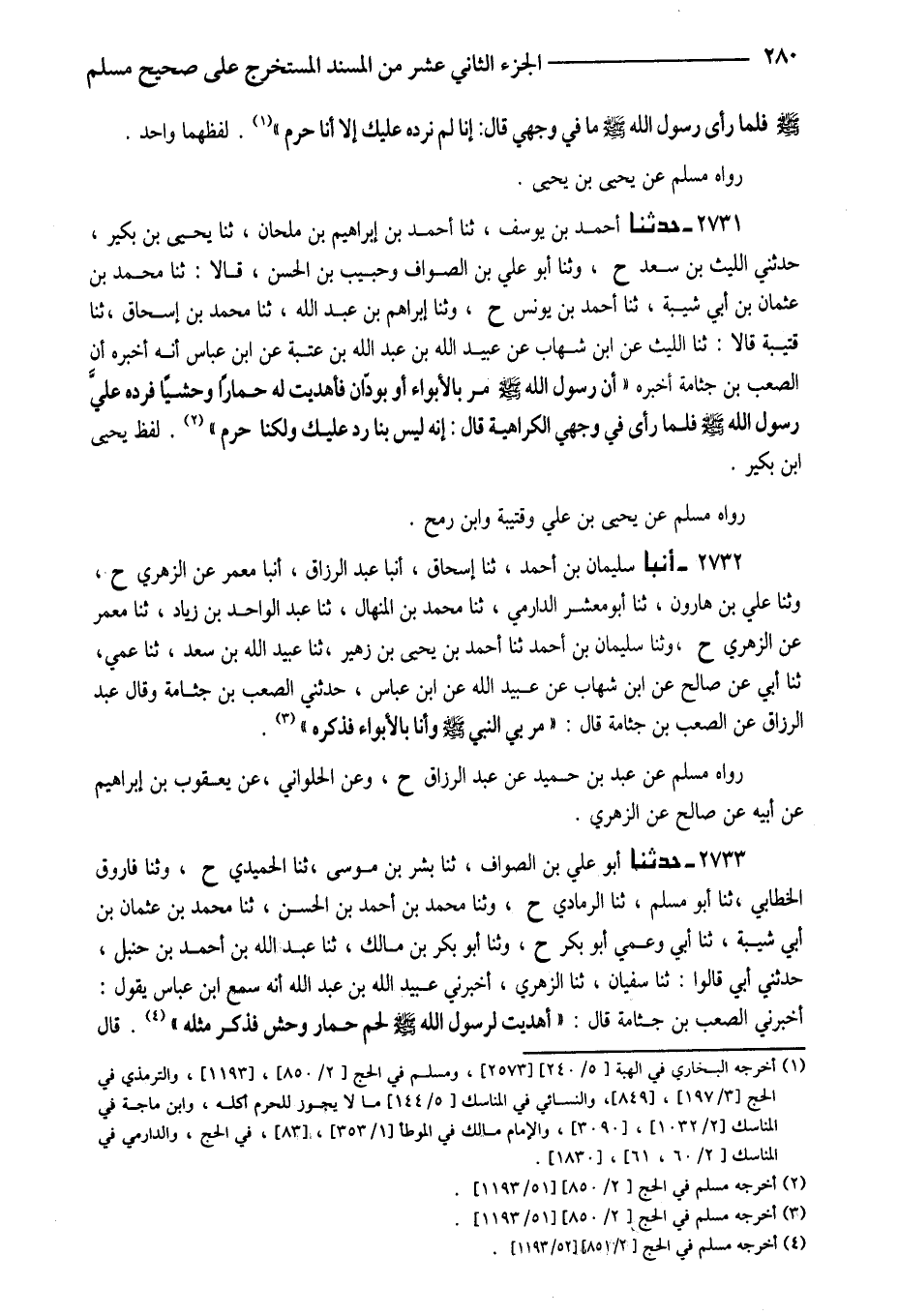 2733 - حَدَّثَنَا أَبُو عَلِيِّ بْنُ الصَّوَّافِ ثَنَا بِشْرُ بْنُ مُوسَى ثَنَا الْحُمَيْدِيُّ ح وثنا فَارُوقٌ الْخَطَّابِيُّ ثَنَا أَبُو مُسْلِمٍ ثَنَا الرَّمَادِيُّ ح وثنا مُحَمَّدُ بْنُ أَحْمَدَ بْنِ الْحَسَنِ ثَنَا مُحَمَّدُ بْنُ عُثْمَانَ بْنِ أَبِي شَيْبَةَ ثَنَا أَبِي وَعَمِّي أَبُو بَكْرٍ ح وثنا أَبُو بَكْرِ بْنُ مَالِكٍ ثَنَا عَبْدُ اللَّهِ بْنُ أَحْمَدَ بْنِ حَنْبَلٍ حَدَّثَنِي أَبِي قَالُوا ثَنَا سُفْيَانُ ثَنَا الزُّهْرِيُّ أَخْبَرَنِي عُبَيْدُ اللَّهِ بْنُ عَبْدِ اللَّهِ أَنَّهُ سَمِعَ ابْنَ عَبَّاسٍ يَقُولُ أَخْبَرَنِي الصَّعْبُ بْنُ جَثَّامَةَ قَالَ أَهْدَيْتُ لِرَسُولِ اللَّهِ صَلَّى اللَّهُ عَلَيْهِ وَسَلَّمَ لَحْمَ حِمَارِ وَحْشٍ فَذَكَرَ مِثْلَهُ قَالَ