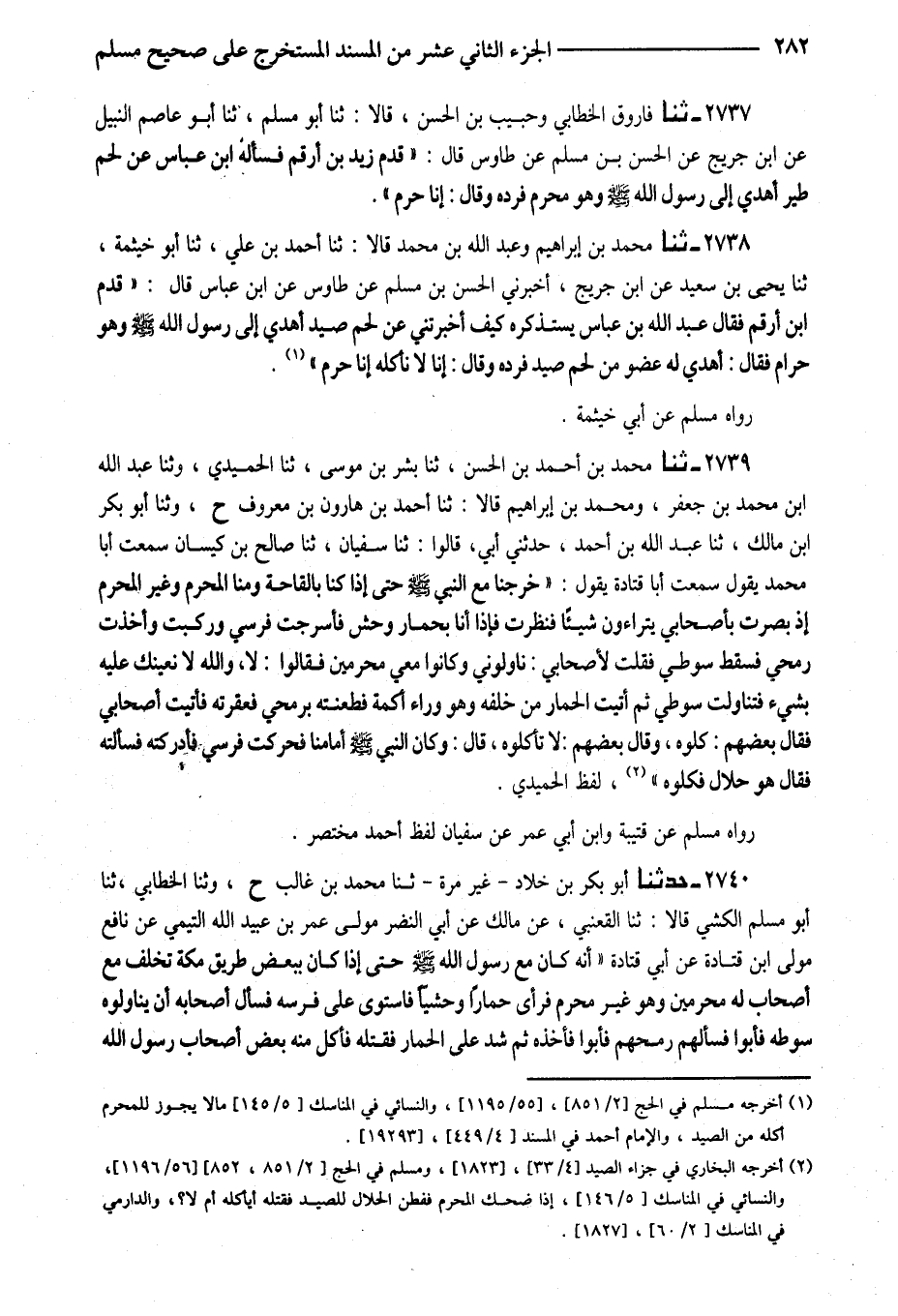 2737 - ثَنَا فَارُوقٌ الْخَطَّابِيُّ وَحَبِيبُ بْنُ الْحَسَنِ قَالا ثَنَا أَبُو مُسْلِمٍ ثَنَا أَبُو عَاصِمٍ النَّبِيلُ عَنْ ابْنُ جُرَيْجٍ عَنِ الْحَسَنِ بْنِ مُسْلِمٍ عَنْ طَاوُسٍ قَالَ قَدِمَ زَيْدُ بْنُ أَرْقَمَ فَسَأَلَهُ ابْنُ عَبَّاسٍ عَنْ لَحْمِ طَيْرٍ أُهْدِيَ إِلَى رَسُولِ اللَّهِ صَلَّى اللَّهُ عَلَيْهِ وَسَلَّمَ وَهُوَ مُحْرِمٌ فَرَدَّهُ وَقَالَ إِنَّا حُرُمٌ