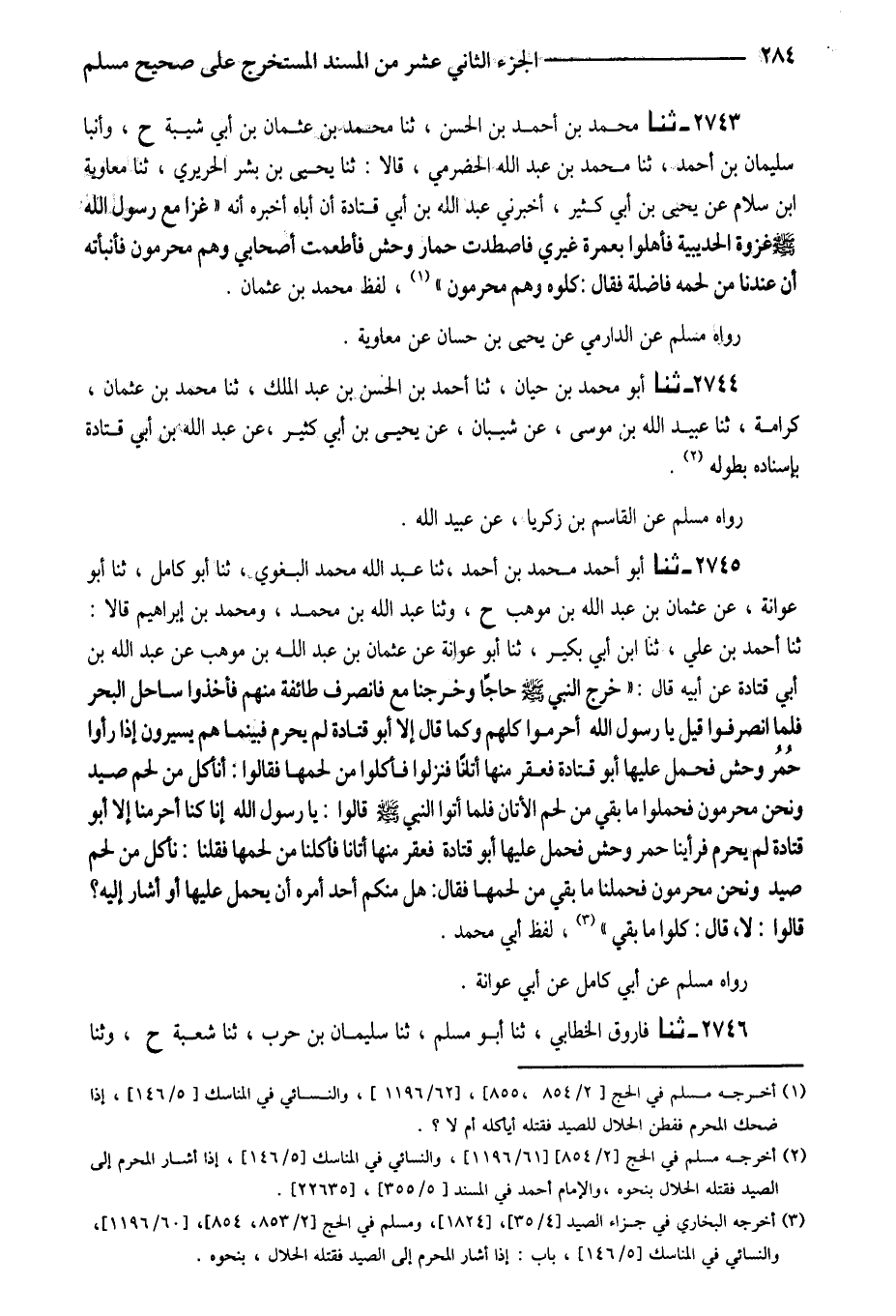 2743 - ثَنَا مُحَمَّدُ بْنُ أَحْمَدَ بْنِ الْحَسَنِ ثَنَا مُحَمَّدُ بْنُ عُثْمَانَ بْنِ أَبِي شَيْبَةَ ح وأنبا سُلَيْمَانُ بْنُ أَحْمَدَ ثَنَا مُحَمَّدُ بْنُ عَبْدِ اللَّهِ الْحَضْرَمِيُّ قَالا ثَنَا يَحْيَى بْنُ بِشْرٍ الْحَرِيرِيُّ ثَنَا مُعَاوِيَة ابْن سَلامٍ عَنْ يَحْيَى بْنِ أَبِي كَثِيرٍ أَخْبَرَنِي عَبْدُ اللَّهِ بْنُ أَبِي قَتَادَةَ أَنَّ أَبَاهُ أَخْبَرَهُ أَنَّهُ غَزَا مَعَ رَسُولِ اللَّهِ صَلَّى اللَّهُ عَلَيْهِ وَسَلَّمَ غَزْوَةَ الْحُدَيْبِيَةِ فَأَهَلُّوا بِعُمْرَةٍ غَيْرِي فَاصْطَدْتُ حِمَارَ وَحْشٍ فَأَطْعَمْتُ أَصْحَابِي وَهُمْ مُحْرِمُونَ فَأَنْبَأْتُهُ أَنَّ عِنْدَنَا مِنْ لَحْمِهِ فَاضِلَةً فَقَالَ كُلُوهُ وَهُمْ محرومون لَفْظُ مُحَمَّدِ بْنِ عُثْمَانَ