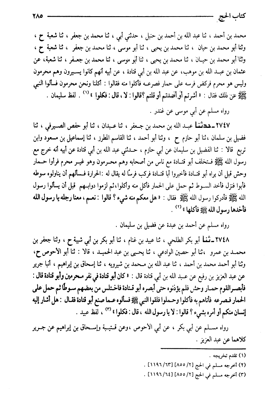 2748 - ثَنَا أَبُو بَكْرٍ الطَّلْحِيُّ ثَنَا عُبَيْدُ بْنُ غَنَّامٍ ثَنَا أَبُو بَكْرِ بْنُ أَبِي شَيْبَةَ ح وثنا جَعْفَرُ بْنُ مُحَمَّدِ بْنِ عَمْرٍو ثَنَا أَبُو حُصَيْنٍ الْوَادِعِيُّ ثَنَا يَحْيَى بْنُ عَبْدِ الْحَمِيدِ قَالا ثَنَا أَبُو الأَحْوَصِ ح وثنا أَبُو أَحْمَدَ مُحَمَّدُ بْنُ أَحْمَدَ ثَنَا عَبْدُ اللَّهِ بْنُ مُحَمَّدِ بْنُ شِيرَوَيْهِ ثَنَا إِسْحَاقُ بْنُ إِبْرَاهِيمَ أَنْبَا جَرِيرٌ عَنْ عَبْدِ الْعَزِيزِ بْنِ رَفِيعٍ عَنْ عَبْدِ اللَّهِ بْنُ أَبِي قَتَادَةَ قَالَ كَانَ أَبُو قَتَادَةَ فِي نَفَرٍ مُحْرِمِينَ وَأَبُو قَتَادَةَ قَالَ فَأَبْصَرَ الْقَوْمُ حِمَارَ وَحْشٍ فَلَمْ يُؤْذِنُوهُ حَتَّى أَبْصَرَهُ أَبُو قَتَادَةَ فَاخْتَلَسَ مِنْ بَعْضِهِمْ سَوْطًا ثُمَّ حَمَلَ عَلَى الْحِمَارِ فَصَرَعَهُ فَأَتَاهُمْ بِهِ فَأَكَلُوا وَحَمَلُوا فَلَقُوا النَّبِيَّ صَلَّى اللَّهُ عَلَيْهِ وَسَلَّمَ فَسَأَلُوهُ عَمَّا صَنَعَ أَبُو قَتَادَةَ فَقَالَ هَلْ أَشَارَ إِلَيْهِ إِنْسَانٌ مِنْكُمْ أَوْ أَمَرَهُ بِشَيْءٍ قَالُوا لَا يَا رَسُولَ اللَّهِ قَالَ فَكُلُوا لَفْظُ عُبَيْدٍ