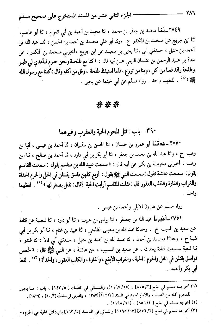 2749 - ثَنَا مُحَمَّدُ بْنُ جَعْفَرِ بْنِ مُحَمَّدٍ ثَنَا مُحَمَّدُ بْنُ أَحْمَدَ بْنِ أَبِي الْعَوَّامِ ثَنَا أَبُو عَاصِمٍ ثَنَا ابْنُ جُرَيْجٍ عَنْ مُحَمَّدِ بْنِ الْمُنْكَدِرِ ح وَثنا أَبُو عَلِيٍّ مُحَمَّدُ بْنُ أَحْمَدَ بْنِ الْحَسَنِ ثَنَا عَبْدُ اللَّهِ بْنُ أَحْمَدَ بْنِ حَنْبَلٍ حَدَّثَنِي أَبِي ثَنَا يَحْيَى بْنُ سَعِيدٍ عَنِ ابْنِ جُرَيْجٍ أَخْبَرَنِي مُحَمَّدُ بْنُ الْمُنْكَدِرِ عَنْ مُعَاذِ بْنِ عَبْدِ الرَّحْمَنِ بْنِ عُثْمَانَ التَّيْمِيِّ عَنْ أَبِيهِ قَالَ كُنَّا مَعَ طَلْحَةَ وَنَحْنُ حُرُمٌ فَأُهْدِيَ لِي طَيْرٌ وَطَلْحَةُ رَاقِدٌ فَمِنَّا مَنْ أَكَلَ وَمِنَّا مَنْ تَوَرَّعَ فَلَمَّا اسْتَيْقَظَ طَلْحَةُ وَفَّقَ مِنْ أَكْلِهِ وَقَالَ أكلنَا مَعَ رَسُولِ اللَّهِ صَلَّى اللَّهُ عَلَيْهِ وَسَلَّمَ