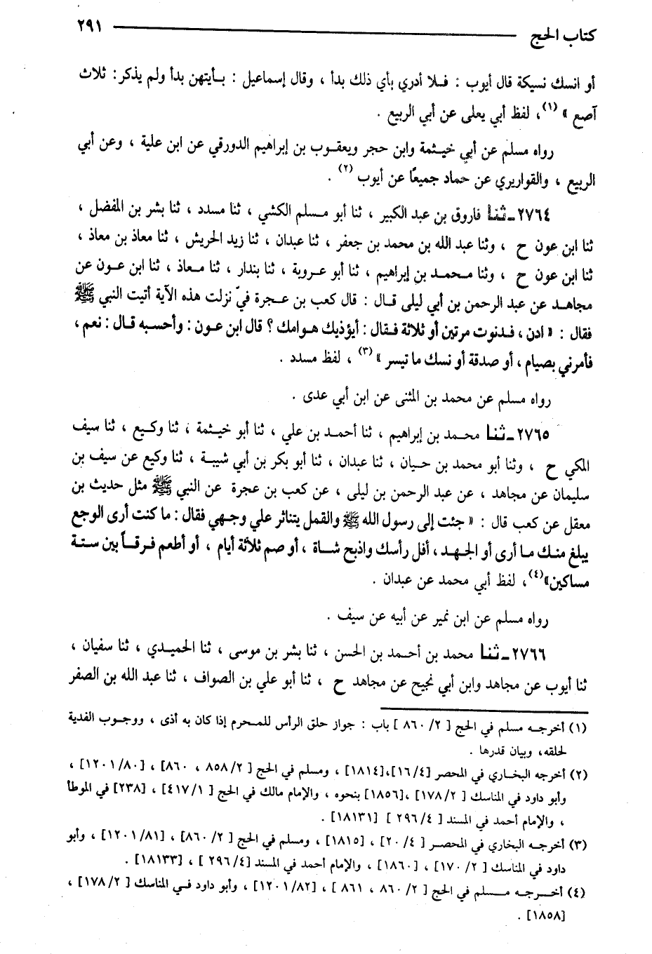 2764 - ثَنَا فاروق عَن عَبْدِ الْكَبِيرِ ثَنَا أَبُو مُسْلِمٍ الْكَشِّيُّ ثَنَا مُسَدَّدٌ ثَنَا بِشْرُ بْنُ الْمُفَضَّلِ ثَنَا ابْنُ عَوْنٍ ح وَثَنَا عَبْدُ اللَّهِ بْنُ مُحَمَّد بْنِ جَعْفَر ثَنَا عَبْدُ ان ثَنَا زَيْدُ الْحَرِيشِ ثَنَا مُعَاذُ بْنُ مُعَاذٍ ثَنَا ابْنُ عَوْنٍ ح وَثَنَا مُحَمَّدُ بْنُ إِبْرَاهِيمَ ثَنَا أَبُو عَرُوبَةَ ثَنَا بُنْدَارٌ ثَنَا مُعَاذٌ ثَنَا ابْنُ عَوْنٍ عَنْ مُجَاهِدٍ عَنْ عَبْدِ الرَّحْمَنِ بْنِ أَبِي لَيْلَى قَالَ قَالَ كَعْب بوجههبن عُجْرَةَ فِيَّ نَزَلَتْ هَذِهِ الْآيَةُ أَتَيْتُ النَّبِيَّ صَلَّى اللَّهُ عَلَيْهِ وَسَلَّمَ فَقَالَ ادْنُ فَدَنَوْتُ مَرَّتَيْنِ أَوْ ثَلاثَةً فَقَالَ أَيُؤْذِيكَ هَوَامُّكَ قَالَ ابْنُ عَوْنٍ وَأَحْسَبُهُ قَالَ نَعَمْ فَأَمَرَنِي بِصِيَامٍ أَوْ صَدَقَةٍ أَوْ نُسُكٍ مَا تَيَسَّرَ لَفْظُ مُسَدَّدٍ