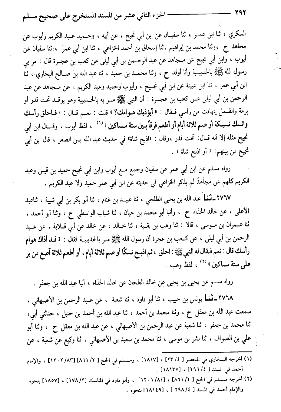 السُّكَّرِيُّ ثَنَا ابْنُ عُمَرَ ثَنَا سُفْيَانُ عَنِ ابْنِ أَبِي نَجِيحٍ عَن أَبِيه وَحميد عبد الْكَرِيمِ وَأَيُّوبُ عَنْ مُجَاهِدٍ ح وَثَنَا مُحَمَّدُ بْنُ إِبْرَاهِيمَ ثَنَا إِسْحَاقُ بْنُ أَحْمَدَ الْخُزَاعِيُّ ثَنَا ابْنُ أَبِي عُمَرَ ثَنَا سُفْيَانُ عَنْ أَيُّوبَ وَابْنِ أَبِي نَجِيحٍ عَنْ مُجَاهِدٍ عَنْ عَبْدِ الرَّحْمَنِ بْنِ أَبِي لَيْلَى عَنْ كَعْبِ بْنِ عُجْرَةَ قَالَ مَرَّ بِي رَسُولُ اللَّهِ صَلَّى اللَّهُ عَلَيْهِ وَسَلَّمَ بِالْحُدَيْبِيَةِ وَأَنَا أُوقِدُ ح وَثنا مُحَمَّدُ بْنُ حُمَيْدٍ ثَنَا عَبْدُ اللَّهِ بْنُ صَالِحٍ الْبُخَارِيُّ ثَنَا ابْنُ أَبِي عُمَرَ ثَنَا ابْنُ عُيَيْنَةَ عَنِ ابْنِ أَبِي نَجِيحٍ وَأَيُّوبَ وَحُمَيْدٍ وَعَبْدِ الْكَرِيمِ عَنْ مُجَاهِدٍ عَنْ عَبْدِ الرَّحْمَنِ بْنِ أَبِي لَيْلَى عَنْ كَعْبِ بْنِ عُجْرَةَ أَنَّ النَّبِيَّ صَلَّى الله عَلَيْهِ وَسلم مر بِهِ بِالْحُدَيْبِية وَهُوَ يُوقد تَحْتَ قِدْرٍ أَوْ بُرْمَةٍ وَالْقَمْلُ يَتَهَافَتُ مِنْ رَأسِي فَقَالَ أَيُؤْذِيكَ هَوَامُّكَ قُلْتُ نَعَمْ قَالَ فَاحْلِقْ رَأْسَكَ وَانْسُكْ نَسِيكَةً أَوْ صُمْ ثَلاثَةَ أَيَّامٍ أَوْ أَطْعِمْ فَرَقًا بَيْنَ سِتَّةِ مَسَاكِينَ لَفْظُ أَيُّوبَ وَقَالَ ابْنُ أَبِي نَجِيحٍ مِثْلَهُ إِلَّا أَنَّهُ قَالَ تَحْتَ قِدْرٍ وَقَالَ اذْبَحْ شَاةً فِي حَدِيثِ عَبْدِ اللَّهِ بْنِ الصَّفَرِ قَالَ ابْنُ أَبِي نَجِيحٍ مِنْ بَيْنِهِمْ أَوِ اذْبَحْ شَاةً