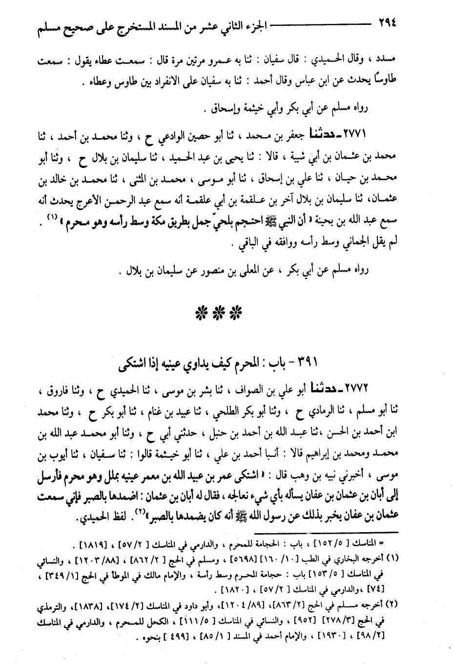 2772 - حَدَّثَنَا أَبُو عَلِيِّ بْنُ الصَّوَّافِ ثَنَا بِشْرُ بْنُ مُوسَى ثَنَا الْحُمَيْدِيُّ ح وثنا فاروق ثَنَا أبومسلم ثَنَا الرَّمَادِيُّ ح وَثَنَا أَبُو بَكْرٍ الطَّلْحِيُّ ثَنَا عُبَيْدُ بْنُ غَنَّامٍ ثَنَا أَبُو بَكْرٍ ح وثنا مُحَمَّدُ بْنُ أَحْمَدَ بْنِ الْحَسَنِ ثَنَا عَبْدُ اللَّهِ بْنُ أَحْمَدَ بْنِ حَنْبَلٍ حَدَّثَنِي أَبِي ح وَثَنَا أَبُو مُحَمَّدٍ عَبْدُ اللَّهِ بْنُ مُحَمَّدٍ وَمُحَمَّدُ بْنُ إِبْرَاهِيمَ قَالا أنبا أَحْمَدُ بْنُ عَلِيٍّ ثَنَا أَبُو خَيْثَمَةَ قَالُوا ثَنَا سُفْيَانُ ثَنَا أَيُّوبُ بْنُ مُوسَى أَخْبَرَنِي نُبَيْهُ بْنُ وَهْبٍ قَالَ اشْتَكَى عُمَرُ بْنُ عُبَيْدِ اللَّهِ بْنِ مَعْمَرٍ عَيْنَيْهِ بِمَلَلٍ وَهُوَ مُحْرِمٌ فَأَرْسَلَ إِلَى أَبَانَ بْنِ عُثْمَانَ بْنِ عَفَّانَ يَسْأَلُهُ بِأَيِّ شَيْءٍ نُعَالِجُهُ فَقَالَ لَهُ أَبَانُ بْنُ عُثْمَانَ اضْمِدْهَا بِالصَّبِرِ فَإِنِّي سَمِعْتُ عُثْمَانَ بْنَ عَفَّانَ يُخْبِرُ بِذَلِكَ عَنْ رَسُولِ اللَّهِ صَلَّى اللَّهُ عَلَيْهِ وَسَلَّمَ أَنَّهُ كَانَ يُضَمِّدُهَا بِالصَّبِرِ