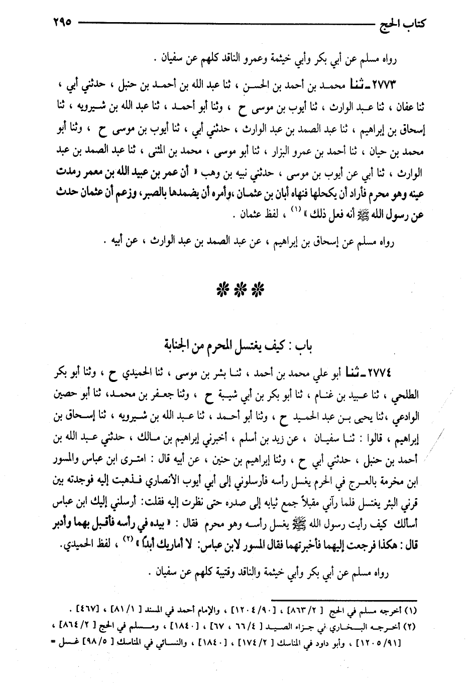 2774 - ثَنَا أَبُو عَلِيٍّ مُحَمَّدُ بْنُ أَحْمَدَ ثَنَا بِشْرُ بْنُ مُوسَى ثَنَا الْحُمَيْدِيُّ ح وَثنا أَبُو بَكْرٍ الطَّلْحِيُّ ثَنَا عُبَيْدُ بْنُ غَنَّامٍ ثَنَا أَبُو بَكْرِ بْنُ أَبِي شَيْبَةَ ح وَثنا جَعْفَرُ بْنُ مُحَمَّدِ ثَنَا أَبُو حُصَيْنٍ الْوَادِعِيُّ ثَنَا يَحْيَى بْنُ عَبْدِ الْحَمِيدِ ح وثنا أَبُو أَحْمَدَ ثَنَا عَبْدُ اللَّهِ بْنُ شِيرَوَيْهِ ثَنَا إِسْحَاقُ بْنُ إِبْرَاهِيمَ قَالُوا ثَنَا سُفْيَانُ عَنْ زَيْدِ بْنِ أَسْلَمَ أَخْبَرَنِي إِبْرَاهِيمُ بْنُ مَالِكٍ حَدَّثَنِي عَبْدُ اللَّهِ بْنُ أَحْمَدَ بْنِ حَنْبَلٍ حَدَّثَنِي أَبِي ح وَثنا إِبْرَاهِيمُ بْنُ حُنَيْنٍ عَنْ أَبِيهِ قَالَ امترى ابْن عَبَّاس والمسور ابْن مَخْرَمَةَ بِالْعَرْجِ فِي الْحَرَمِ يَغْسِلُ رَأْسَهُ فَأَرْسَلُونِي إِلَى أَبِي أَيُّوبَ الأَنْصَارِيِّ فَذَهَبْتُ إِلَيْهِ فَوَجَدْتُهُ بَيْنَ قَرْنَيِ الْبِئْرِ يَغْتَسِلُ فَلَمَّا رَآنِي مُقْبِلًا جَمَعَ ثِيَابَهُ إِلَى صَدْرِهِ حَتَّى نَظَرْتُ إِلَيْهِ فَقُلْتُ أَرْسَلَنِي إِلَيْكَ ابْنُ عَبَّاسٍ أَسْأَلُكَ كَيْفَ رَأَيْتُ رَسُولَ اللَّهِ صَلَّى اللَّهُ عَلَيْهِ وَسَلَّمَ يَغْسِلُ رَأْسَهُ وَهُوَ مُحْرِمٌ فَقَالَ بِيَدِهِ فِي رَأْسِهِ فَأَقْبَلَ بِهِمَا وَأَدْبَرَ قَالَ هَكَذَا فَرَجَعْتُ إِلَيْهِمَا فَأَخْبَرْتُهُمَا فَقَالَ الْمِسْوَرُ لِابْنِ عَبَّاسٍ لَا أُمَارِيكَ أَبَدًا لفظ الْحميدِي
