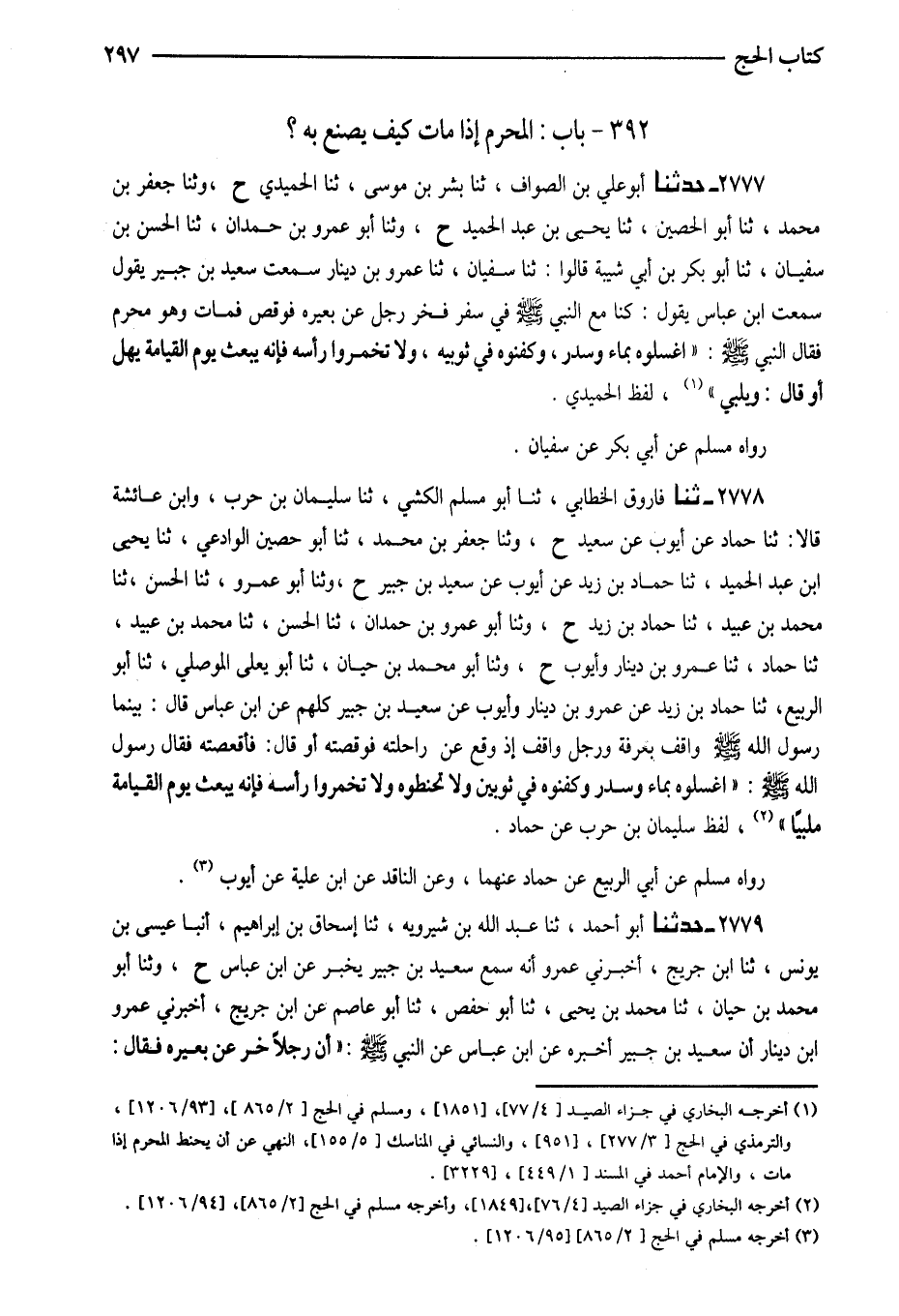 2777 - حَدَّثَنَا أَبُو عَلِيِّ بْنِ الصَّوَّافِ ثَنَا بِشْرُ بْنُ مُوسَى ثَنَا الْحُمَيْدِيُّ ح وثنا جَعْفَرُ بْنُ مُحَمَّدٍ ثَنَا أَبُو الْحُصَيْنِ ثَنَا يَحْيَى بْنُ عَبْدِ الْحَمِيدِ ح وَثنا أَبُو عَمْرِو بْنُ حَمْدَانَ ثَنَا الْحَسَنُ بْنُ سُفْيَانَ ثَنَا أَبُو بَكْرِ بْنُ أَبِي شَيْبَةَ قَالُوا ثَنَا سُفْيَانُ ثَنَا عَمْرُو بْنُ دِينَارٍ سَمِعْتُ سَعِيدَ بْنَ جُبَيْرٍ يَقُولُ سَمِعْتُ ابْنَ عَبَّاسٍ يَقُولُ كُنَّا مَعَ النَّبِيِّ صَلَّى اللَّهُ عَلَيْهِ وَسَلَّمَ فِي سَفَرٍ فَخَرَّ رَجُلٌ عَنْ بَعِيرِهِ فَوُقِصَ فَمَاتَ وَهُوَ مُحْرِمٌ فَقَالَ النَّبِيُّ صَلَّى اللَّهُ عَلَيْهِ وَسَلَّمَ اغْسِلُوهُ بِمَاءٍ وَسِدْرٍ وَكَفِّنُوهُ فِي ثَوْبَيْهِ وَلا تُخَمِّرُوا رَأْسَهُ فَإِنَّهُ يُبْعَثُ يَوْمَ الْقِيَامَةِ يُهِلُّ أَوْ قَالَ وَيُلَبِّي لَفْظُ الْحُمَيْدِيِّ