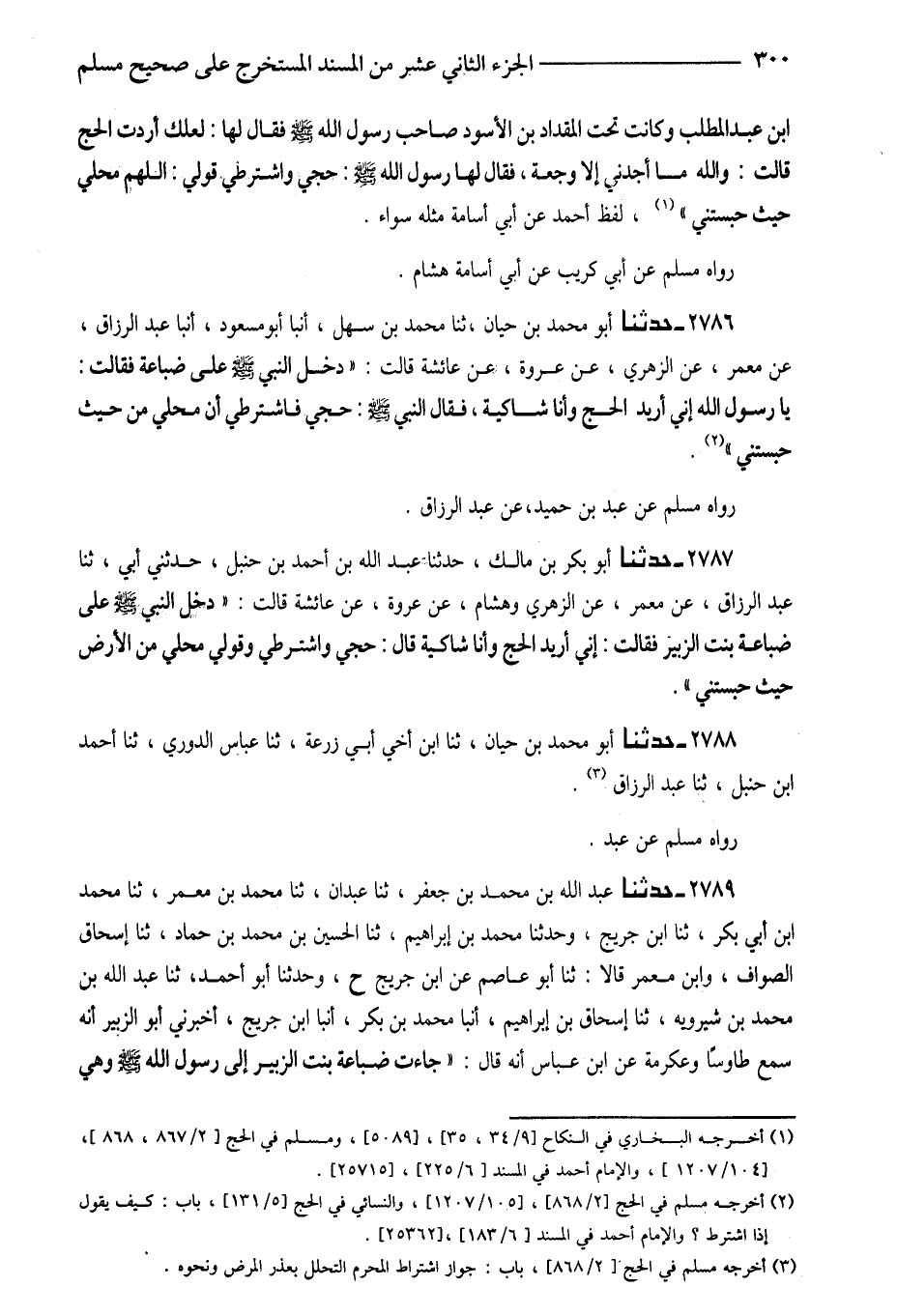 2786 - حَدَّثَنَا أَبُو مُحَمَّدِ بْنُ حَيَّانَ ثَنَا مُحَمَّدُ بْنُ سَهْلٍ أَنْبَأَ أَبُو مَسْعُودٍ أَنْبَأَ عَبْدُ الرَّزَّاقِ عَنْ مَعْمَرٍ عَنِ الزُّهْرِيِّ عَنْ عُرْوَةَ عَنْ عَائِشَةَ قَالَتْ دَخَلَ النَّبِيُّ صَلَّى اللَّهُ عَلَيْهِ وَسَلَّمَ عَلَى ضُبَاعَةَ فَقَالَتْ يَا رَسُولَ اللَّهِ إِنِّي أُرِيدُ الْحَجَّ وَأَنَا شَاكِيَةٌ فَقَالَ النَّبِيُّ صَلَّى اللَّهُ عَلَيْهِ وَسَلَّمَ حُجِّي فَاشْتَرِطِي أَنَّ مَحِلِّي مِنْ حَيْثُ حَبَسْتَنِي