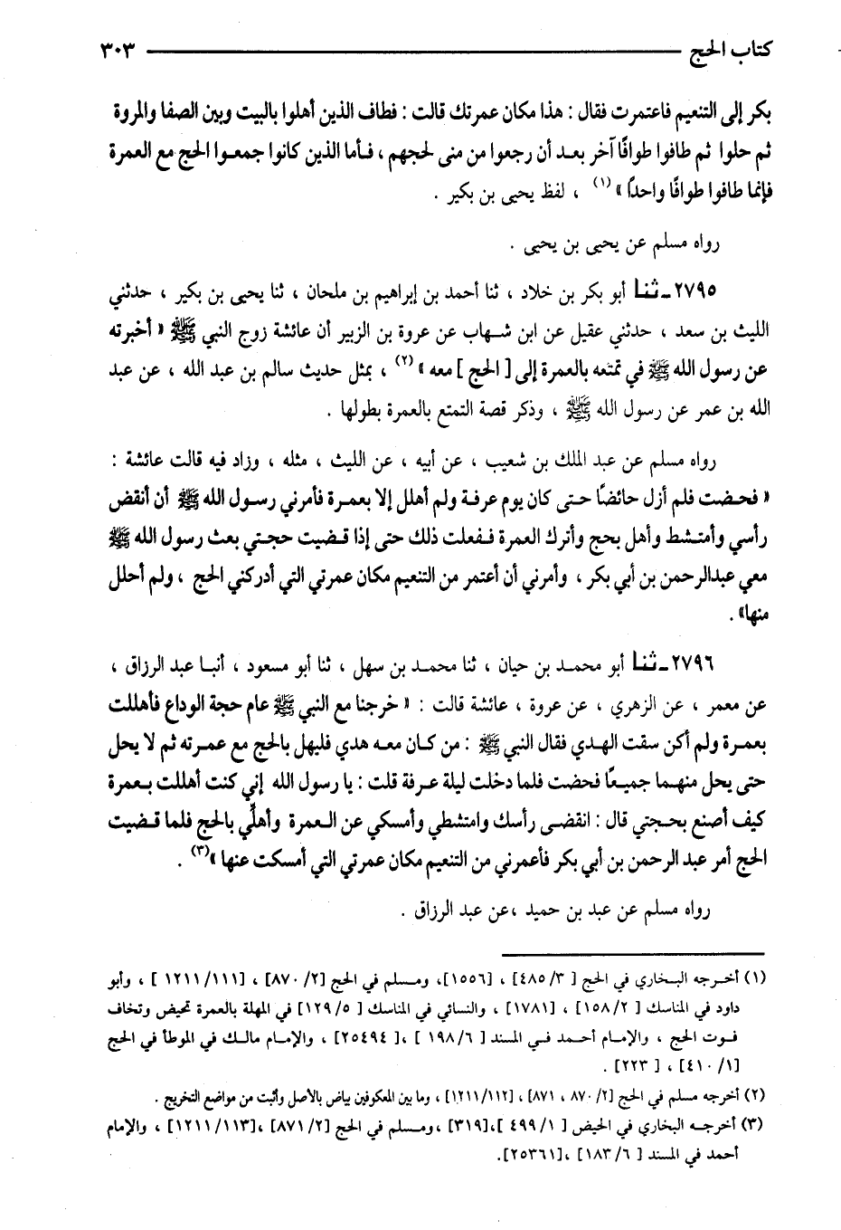 2796 - ثَنَا أَبُو مُحَمَّدِ بْنُ حَيَّانَ ثَنَا مُحَمَّدُ بْنُ سَهْلٍ ثَنَا أَبُو مَسْعُودٍ أنبا عَبْدُ الرَّزَّاقِ عَنْ مَعْمَرٌ عَنِ الزُّهْرِيِّ عَنْ عُرْوَةَ عَائِشَةُ قَالَتْ خَرَجْنَا مَعَ النَّبِيِّ صَلَّى اللَّهُ عَلَيْهِ وَسَلَّمَ عَامَ حَجَّةِ الْوَدَاعِ فَأَهْلَلْتُ بِعُمْرَةٍ وَلَمْ أَكُنْ سُقْتُ الْهَدْيَ فَقَالَ النَّبِيُّ صَلَّى اللَّهُ عَلَيْهِ وَسَلَّمَ مِنْ كَانَ مَعَهُ هَدْيٌ فَلْيُهِلَّ بِالْحَجِّ مَعَ عُمْرَتِهِ ثُمَّ لَا يَحِلَّ حَتَّى يَحِلَّ مِنْهُمَا جَمِيعًا فَحِضْتُ فَلَمَّا دَخَلَتْ لَيْلَةُ عَرَفَةَ قُلْتُ يَا رَسُولَ اللَّهِ إِنِّي كُنْتُ أَهْلَلْتُ بِعُمْرَةٍ كَيْفَ أَصْنَعُ بِحَجَّتِي قَالَ انْقُضِي رَأْسَكِ وَامْتَشِطِي وَأَمْسِكِي عَنِ الْعُمْرَةِ وَأَهِلِّي بِالْحَجِّ فَلَمَّا قَضَيْتُ الْحَجَّ أَمَرَ عَبْدَ الرَّحْمَنِ بْنَ أَبِي بَكْرٍ فَأَعْمَرَنِي مِنَ التَّنْعِيمِ مَكَانَ عُمْرَتِي الَّتِي أَمْسَكْتُ عَنْهَا