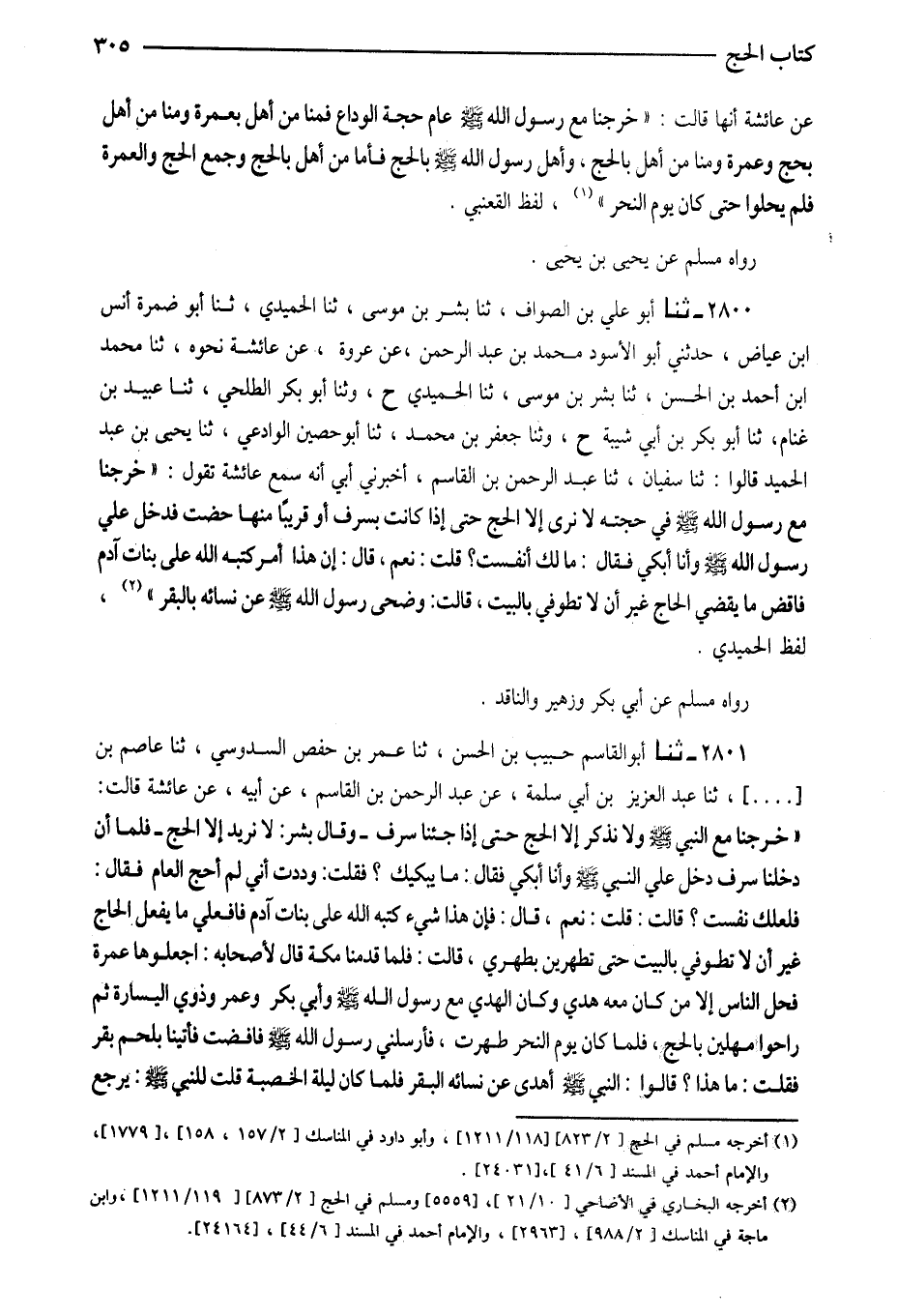 2800 - ثَنَا أَبُو عَلِيِّ بْنُ الصَّوَّافِ ثَنَا بِشْرُ بْنُ مُوسَى ثَنَا الْحُمَيْدِيُّ ثَنَا أَبُو ضَمرَة أنس ابْن عِيَاضٍ حَدَّثَنِي أَبُو الأَسْوَدِ مُحَمَّدُ بْنِ عَبْدِ الرَّحْمَنِ عَنْ عُرْوَةَ عَنْ عَائِشَةَ نَحْوَهُ ثَنَا مُحَمَّدُ ابْن أَحْمَدَ بْنِ الْحَسَنِ ثَنَا بِشْرُ بْنُ مُوسَى ثَنَا الْحُمَيْدِيُّ ح وَثنا أَبُو بَكْرٍ الطَّلْحِيُّ ثَنَا عُبَيْدُ بْنُ غَنَّامٍ ثَنَا أَبُو بَكْرِ بْنُ أَبِي شَيْبَةَ وثنا جَعْفَرُ بْنُ مُحَمَّدٍ ثَنَا أَبُو حُصَيْنٍ الْوَادِعِيُّ ثَنَا يَحْيَى بْنُ عَبْدِ الْحَمِيدِ قَالُوا ثَنَا سُفْيَانُ ثَنَا عَبْدُ الرَّحْمَنِ بْنُ الْقَاسِمِ أَخْبَرَنِي أَبِي أَنَّهُ سَمِعَ عَائِشَةَ تَقُولُ خَرَجْنَا مَعَ رَسُولِ اللَّهِ صَلَّى اللَّهُ عَلَيْهِ وَسَلَّمَ فِي حَجَّتِهِ لَا نَرَى إِلَّا الْحَجَّ حَتَّى إِذا كَانَت بِسَرِفَ أَوْ قَرِيبًا مِنْهَا حِضْتُ فَدَخَلَ عَلَيَّ رَسُولُ اللَّهِ صَلَّى اللَّهُ عَلَيْهِ وَسَلَّمَ وَأَنَا أَبْكِي فَقَالَ مَا لَكِ أَنُفِسْتِ قُلْتُ نَعَمْ قَالَ إِنَّ هَذَا أَمْرٌ كَتَبَهُ اللَّهُ عَلَى بَنَاتِ آدَمَ فَاقْضِ مَا يَقْضِي الْحَاجُّ غَيْرَ أَنْ لَا تَطُوفِي بِالْبَيْتِ قَالَتْ وَضَحَّى رَسُولُ اللَّهِ صَلَّى اللَّهُ عَلَيْهِ وَسَلَّمَ عَنْ نِسَائِهِ بِالْبَقَرِ لَفْظُ الْحُمَيْدِيِّ