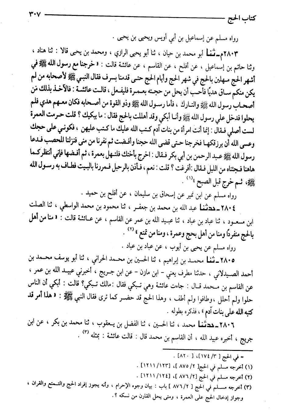2803 - م ثَنَا أَبُو مُحَمَّدِ بْنُ حَيَّانَ ثَنَا أَبُو يَحْيَى الرَّازِيُّ وَمُحَمَّدُ بْنُ يَحْيَى قَالا ثَنَا هَنَّادٌ وَثنا حَاتِمُ بْنُ إِسْمَاعِيلَ عَنْ أَفْلَحَ عَنِ الْقَاسِمِ عَنْ عَائِشَةَ قَالَتْ خَرَجْنَا مَعَ رَسُولِ اللَّهِ صَلَّى اللَّهُ عَلَيْهِ وَسَلَّمَ فِي أَشْهُرِ الْحَجِّ مُهِلِّينَ بِالْحَجِّ فِي شَهْرِ الْحَجِّ وَأَيَّامِ الْحَجِّ حَتَّى قَدِمْنَا بِسَرِفَ فَقَالَ النَّبِيُّ صَلَّى اللَّهُ عَلَيْهِ وَسَلَّمَ لِأَصْحَابِهِ مَنْ لَمْ يَكُنْ مِنْكُمْ سَاقَ هَدْيًا فَأَحَبَّ أَنْ يَحِلَّ مِنْ حَجَّتِهِ بِعُمْرَةٍ فَلْيَفْعَلْ قَالَتْ عَائِشَةُ فَالْآخِذُ بِذَلِكَ مِنْ أَصْحَابِ رَسُولِ اللَّهِ صَلَّى اللَّهُ عَلَيْهِ وَسَلَّمَ وَالتَّارِكُ فَأَمَّا رَسُولُ اللَّهِ صَلَّى اللَّهُ عَلَيْهِ وَسَلَّمَ وَذُو الْقُوَّةِ مِنْ أَصْحَابِهِ فَكَانَ مَعَهُمْ هَدْيٌ فَلَمْ يَحِلُّوا فَدَخَلَ عَلَيَّ رَسُولُ اللَّهِ صَلَّى اللَّهُ عَلَيْهِ وَسَلَّمَ وَأَنَا أَبْكِي وَقَدْ أَهْلَلْتُ بِالْحَجِّ فَقَالَ مَا يُبْكِيكِ قُلْتُ حُرِمْتُ الْعُمْرَةَ لَسْتُ أُصَلِّي فَقَالَ إِنَّما أَنْتِ امْرَأَةٌ مِنْ بَنَاتِ آدَمَ كَتَبَ اللَّهُ عَلَيْكِ مَا كَتَبَ عَلَيْهِنَّ فَكُونِي عَلَى حَجِّكِ وَعَسَى الله أَن يرزقكها فَخَرَجْنَا حَتَّى قَضَى اللَّهُ حَجَّنَا وَأَفَضْتُ ثُمَّ نَفَرْنَا مِنْ مِنًى فَنَزَلْنَا الْمُحَصَّبَ فَدَعَا رَسُولُ اللَّهِ صَلَّى اللَّهُ عَلَيْهِ وَسَلَّمَ عَبْدٌ الرَّحْمَنِ بْنَ أَبِي بَكْرٍ فَقَالَ اخْرُجْ بِأُخْتِكَ فَلْتُهِلَّ بِعُمْرَةٍ ثُمَّ أَفِضْهَا فَإِنِّي أَنْتَظِرُكُمَا هَاهُنَا فَجِئْنَاهُ مِنَ اللَّيْلِ فَقَالَ أَفَرَغْتِ قُلْتُ نَعَمْ فَأَذِنَ بِالرَّحِيلِ فَمَرَرْنَا بِالْبَيْتِ فَطَافَ بِهِ رَسُولُ اللَّهِ صَلَّى اللَّهُ عَلَيْهِ وَسَلَّمَ ثُمَّ خَرَجَ قَبْلَ الصُّبْحِ