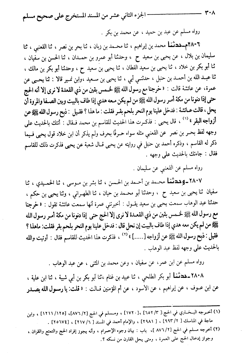 2806 - م حَدَّثَنَا مُحَمَّدُ بْنُ إِبْرَاهِيمَ ثَنَا مُحَمَّدُ بْنُ زَبَّانَ ثَنَا بَحْرُ بْنُ نَصْرٍ ثَنَا الْقَعْنَبِيُّ ثَنَا سُلَيْمَانُ بْنُ بِلالٍ عَنْ يَحْيَى بْنِ سَعِيدٍ ح وَحَدَّثَنَا أَبُو عَمْرِو بْنُ حَمْدَانَ ثَنَا الْحَسَنُ بْنُ سُفْيَانَ ثَنَا أَبُو بَكْرِ بْنُ خَلادٍ ثَنَا يَحْيَى بْنُ سَعِيدٍ الْقَطَّانُ ثَنَا يَحْيَى بْنُ سَعِيدٍ ح وَحَدَّثَنَا أَبُو بَكْرِ بْنُ مَالِكٍ ثَنَا عَبْدُ اللَّهِ بْنُ أَحْمَدَ بْنِ حَنْبَلٍ حَدَّثَنِي أَبِي ثَنَا يَحْيَى بْنُ سَعِيدٍ وَابْنُ نُمَيْرٍ قَالا ثَنَا يَحْيَى عَنْ عَمْرَةَ عَنْ عَائِشَةَ قَالَتْ خَرَجْنَا مَعَ رَسُولُ اللَّهِ صَلَّى اللَّهُ عَلَيْهِ وَسَلَّمَ لِخَمْسٍ بَقَيْنَ مِنْ ذِي الْقِعْدَةِ لَا نَرَى إِلَّا أَنَّهُ الْحَجُّ حَتَّى إِذَا دَنَوْنَا مِنْ مَكَّةَ أَمَرَ رَسُولُ اللَّهِ صَلَّى اللَّهُ عَلَيْهِ وَسَلَّمَ مَنْ لَمْ يَكُنْ مَعَهُ هَدْيٌ إِذَا طَافَ بِالْبَيْتِ وَبَيْنَ الصَّفَا وَالْمَرْوَةِ أَنْ يَحِلَّ قَالَتْ عَائِشَةُ فَدَخَلَ عَلَيْنَا يَوْمُ النَّحْرِ بِلَحْمِ بَقَرٍ فَقُلْتُ مَا هَذَا فَقِيلَ ذَبَحَ رَسُولُ اللَّهِ صَلَّى اللَّهُ عَلَيْهِ وَسَلَّمَ عَنْ أَزْوَاجِهِ الْبَقَرَ قَالَ يَحْيَى فَذَكَرْتُ هَذَا الْحَدِيثَ لِلْقَاسِمِ بْنِ مُحَمَّدٍ فَقَالَ أَتَتْكَ بِالْحَدِيثِ عَلَى وَجْهِهِ لَفْظُ بَحْرِ بْنِ نَصْرٍ عَنِ الْقَعْنَبِيِّ مِثْلُهُ سَوَاءٌ حَرْفًا بِحرف وَلم يذكر أَن ابْنُ خَلادٍ قَوْلَ يَحْيَى فِيمَا ذَكَرَ لَهُ الْقَاسِمُ وَذَكَرَهُ أَحْمَدُ بْنُ حَنْبَلٍ فِي رِوَايَتِهِ عَنْ يَحْيَى قَالَ شُعْبَةُ عَنْ يَحْيَى فَذَكَرْتُ ذَلِكَ لِلْقَاسِمِ فَقَالَ جَاءَتْكَ بِالْحَدِيثِ عَلَى وَجْهِهِ